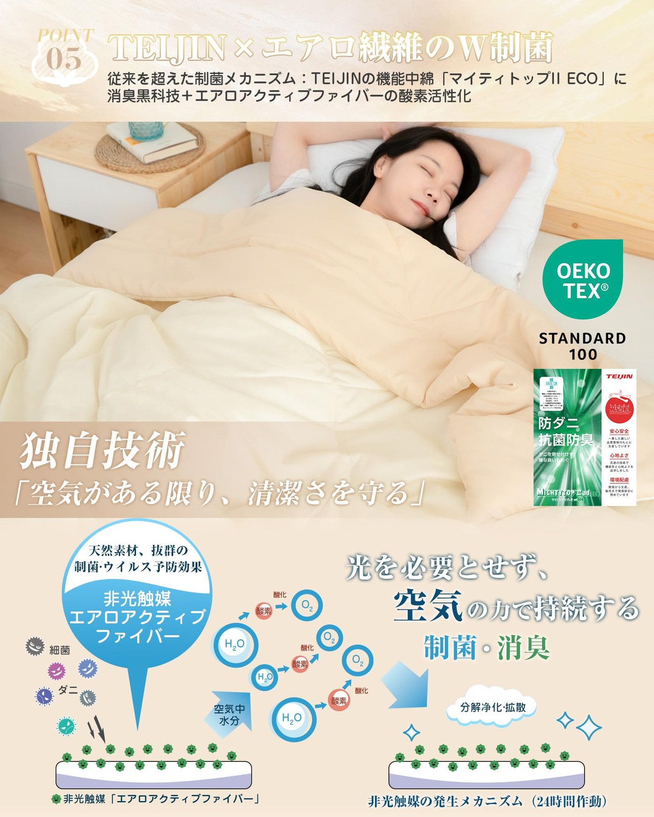 【TEIJIN×エアロ繊維のW制菌】湿気や汗でジメジメする夏は、菌が繁殖しやすい季節です。中わたにテイジンの機能繊維「マイティトップII ECO」と、エアロアクティブファイバーの酸素活性化の組み合わせで、空気がある限り、24時間持続的に制菌消臭作用を発揮。低ホルムアルデヒド設計で、お子様にも配慮した仕様。洗濯しても抗菌防臭・防ダニ効果は持続します。