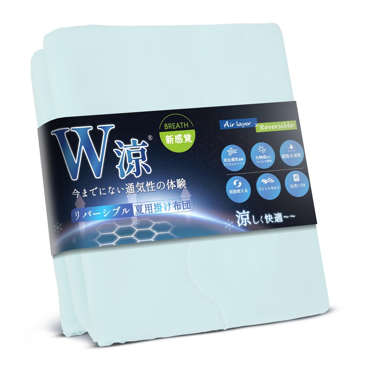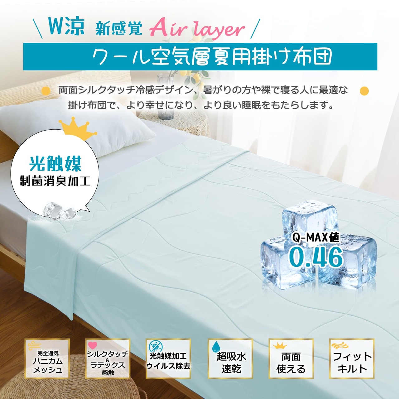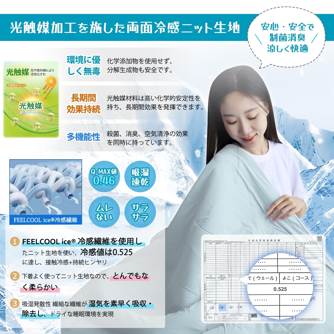 【表生地の究極の精緻を】夏用掛け布団の側は、FEELCOOL ice冷感繊維を使用したニット生地を使い、冷感値は0.46に達し、通常の夏布団の2倍以上です。FEELCOOL iceは、繊維内部に冷感結晶体を練りこんだ素材で、吸熱が遅く、散熱が早い特徴を持ち、触れるだけでひんやり感を感じます。寝返り時や肌が生地に触れるたびに冷感効果を実感でき、エアコン使用時間を減らし、省エネで体にも優しいです。更に、光触媒加工されたので、日光や蛍光灯などの光に反応し、一般的な細菌、臭い、カビ、有害化学物質を分解して無害化します。汗や湿気による臭いや細菌を気にせず、いつでも清潔で爽やかな肌触りを楽しめます!