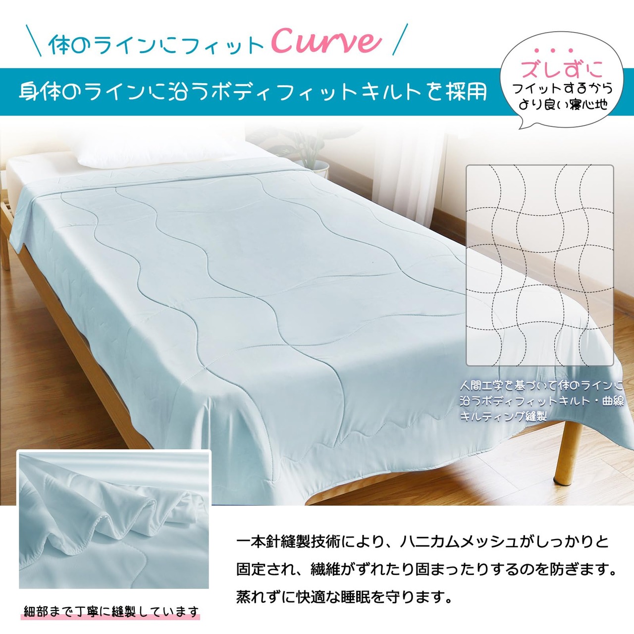 【こだわりキルト】掛け布団は一本針縫製技術を採用し、ハニカムメッシュがしっかりと固定され、繊維のずれや固まりを防ぎます。埃が出ることはなく、お子様やアレルギーの方にも安心してお使いいただけます。さらに、人間工学に基づいて体のラインに沿うボディフィットキルトと曲線キルティング縫製を採用。寝返りを打っても体から滑り落ちることなく、優しく包み込まれるような寝心地を提供。朝まで涼しく、快適に安眠できます。