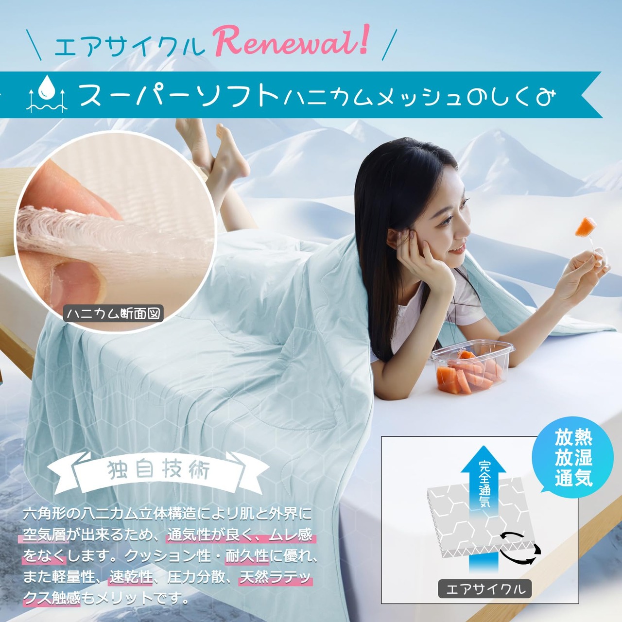 【詰め素材もこだわりの新感覚を】夏用掛け布団の中身には、新開発のスーパーソフトなハニカムメッシュ素材を使用。一般的な綿入りの夏布団とは異なり、ハニカム構造は立体六角形で、寝ている間に体温と湿気を素早く発散させ、空気層を形成してエアコンの冷気を保持します。暑い夜でも涼感を保ちながら快適な眠りをサポートします。さらに、軽量性、通気性、速乾性に優れ、圧力分散にも効果的。天然ラテックスのような触感で、寝心地も非常に快適です。涼感夏布団があなたの体と心を癒し、快適な眠りへと導きます。