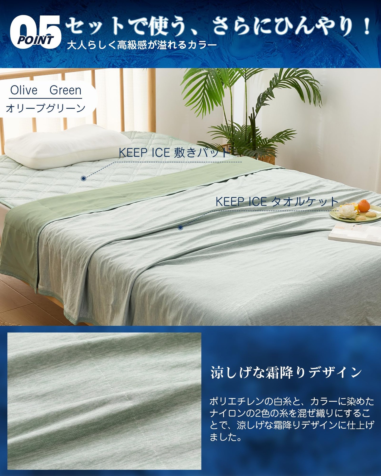 【VKKEEPICE 糸冷感繊維】VKKEEPICE 糸は繊維界トップクラスの熱伝導率の高さを誇るPE素材を使用して、業界最高レベルの冷たさを実現しました。触れた時の冷たさだけではなく、深部体温が下がることで、ずっと『ちょうどいい』冷たさをキープ、朝までひんやり持続。暑がりさんも朝までぐっすり。