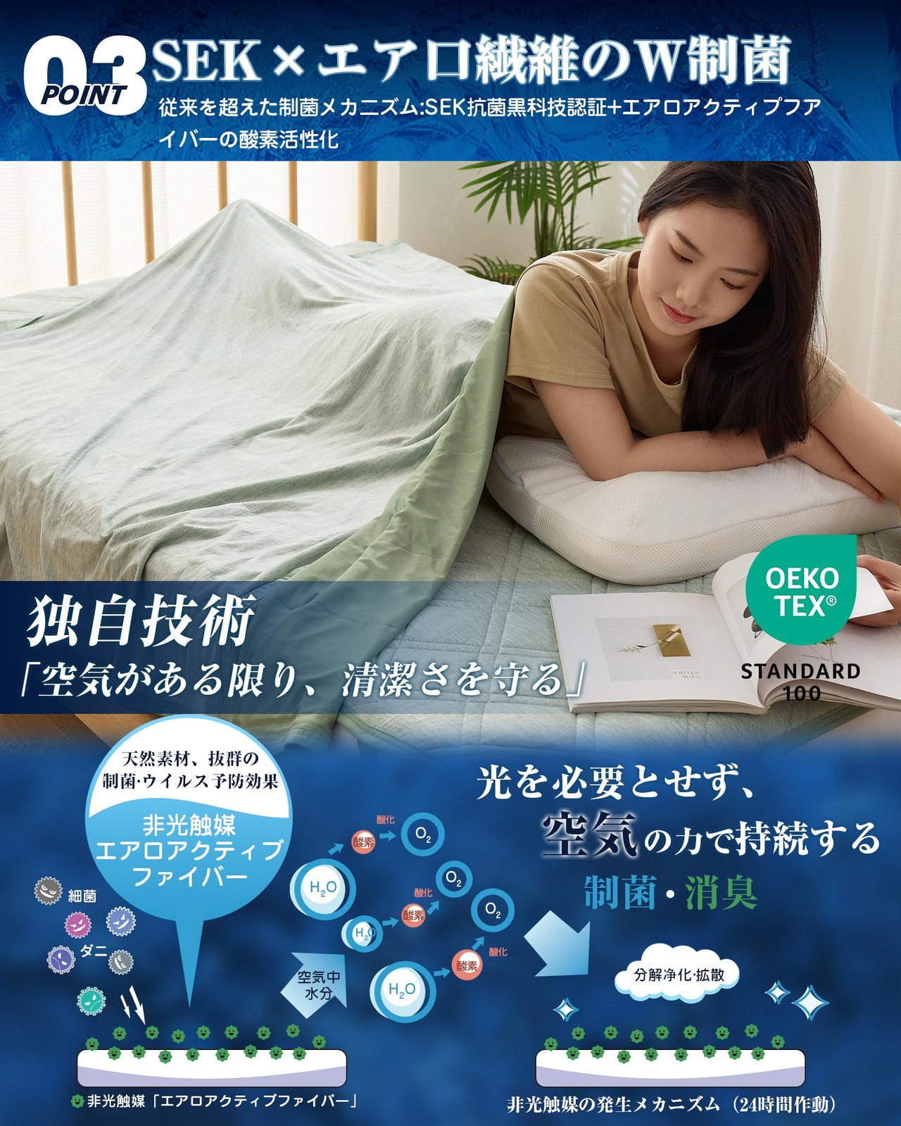 【エアロ繊維の制菌】 湿気や汗でジメジメする夏は、菌が繁殖しやすい季節です。エアロアクティブファイバーの酸素活性化の組み合わせで、空気がある限り、24時間持続的に制菌消臭作用を発揮する。低ホルムアルデヒドなのでお子様にも安心。洗濯しても抗菌防臭・防ダニ効果は持続します。