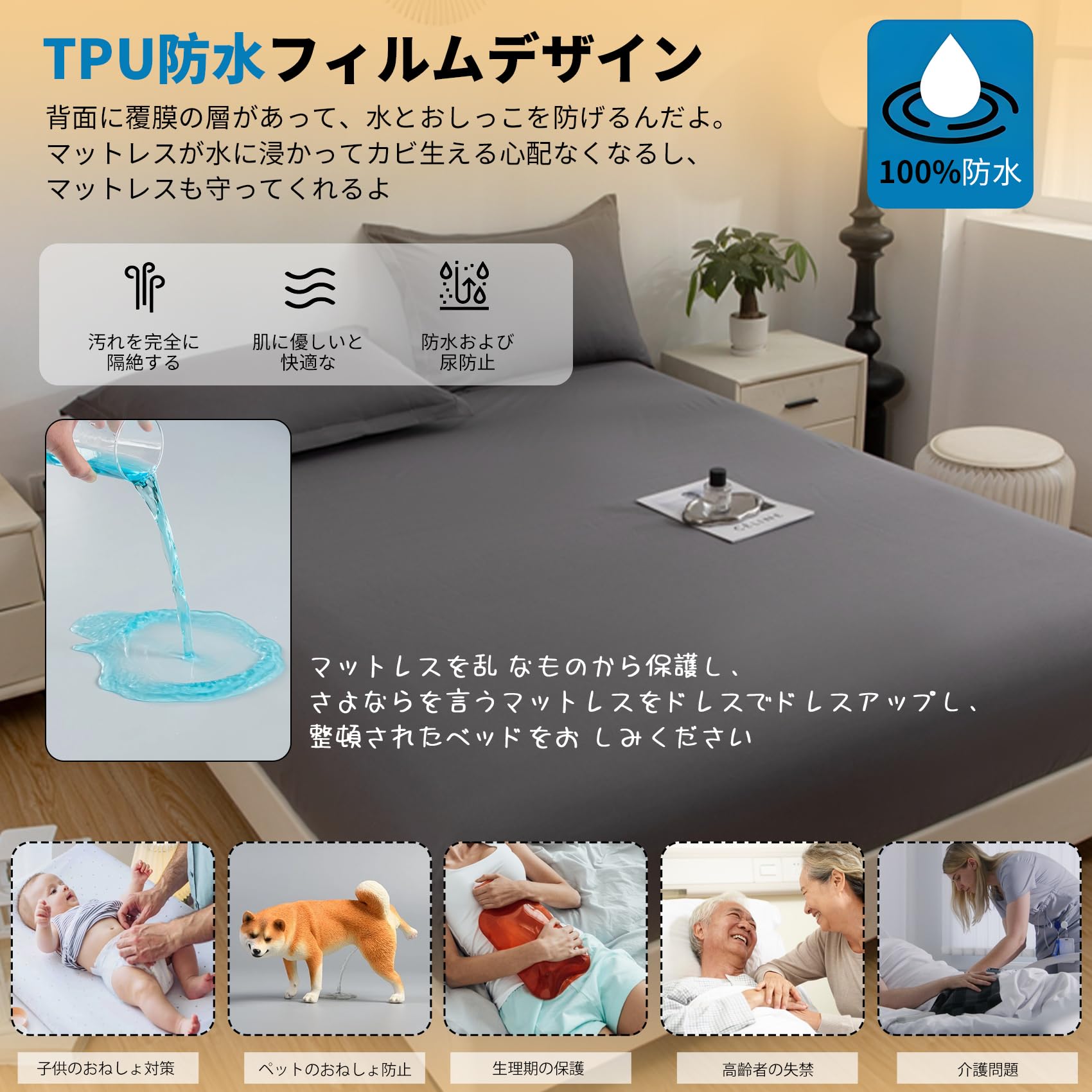 【五面防水設計&圧倒的な防水性】:裏面には通気性の高いTPU防水膜を採用し、通常の防水膜よりも通気性が高く、粘りも強くなる。従来品に比べて、五面防水設計を採用し、ベッド表面だけでなく側面部分も防水仕様なので、カバーエリアが広がります。防水性を高めて、汗・水などをかけでも、マットレスに水分は到達しません,お子様のおねしょやペットのそそう、高齢者・病人などの介護用寝具を汚してしまう心配を軽減し、清潔・衛生的に保ち、心地よい眠りをサポート。