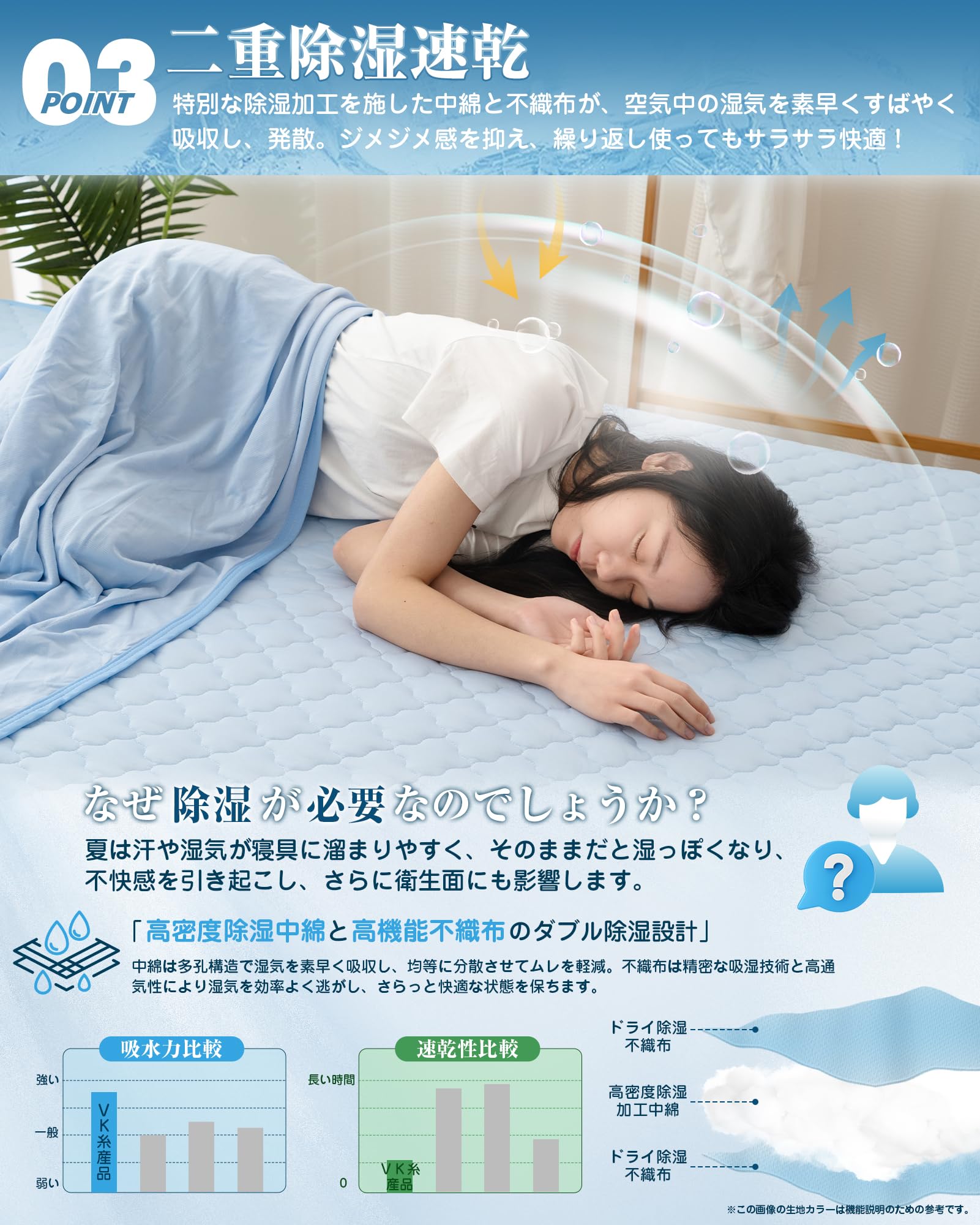 【二重除湿速乾】夏の寝苦しさは、温度だけでなく、湿気も夏の寝苦しさの要因となる。特別な除湿加工を施した中綿と不織布が、空気中の湿気を素早く吸収し、発散する。湿度を50±5%に近づけることでじめじめ感を解消、繰り返し使ってもサラサラ快適!