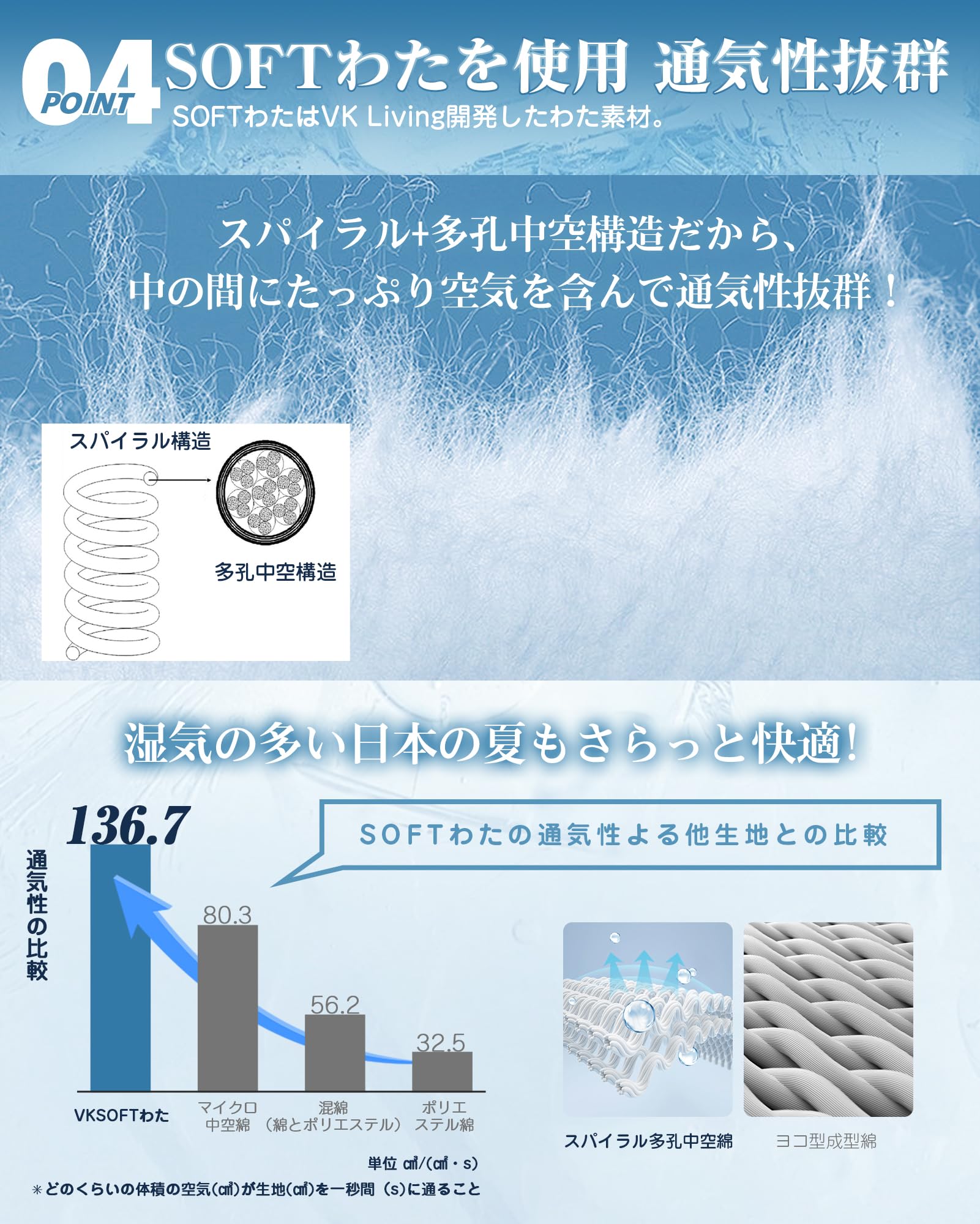 【超速乾スパイラルわた】VK Living独自開発の「3Dスパイラル速乾構造」スパイラル+多孔中空構造だから、中の間にたっぷり空気を含んで、通常の中空綿より1.5倍の通気性、夜中のベタつきとはもうサヨナラ!