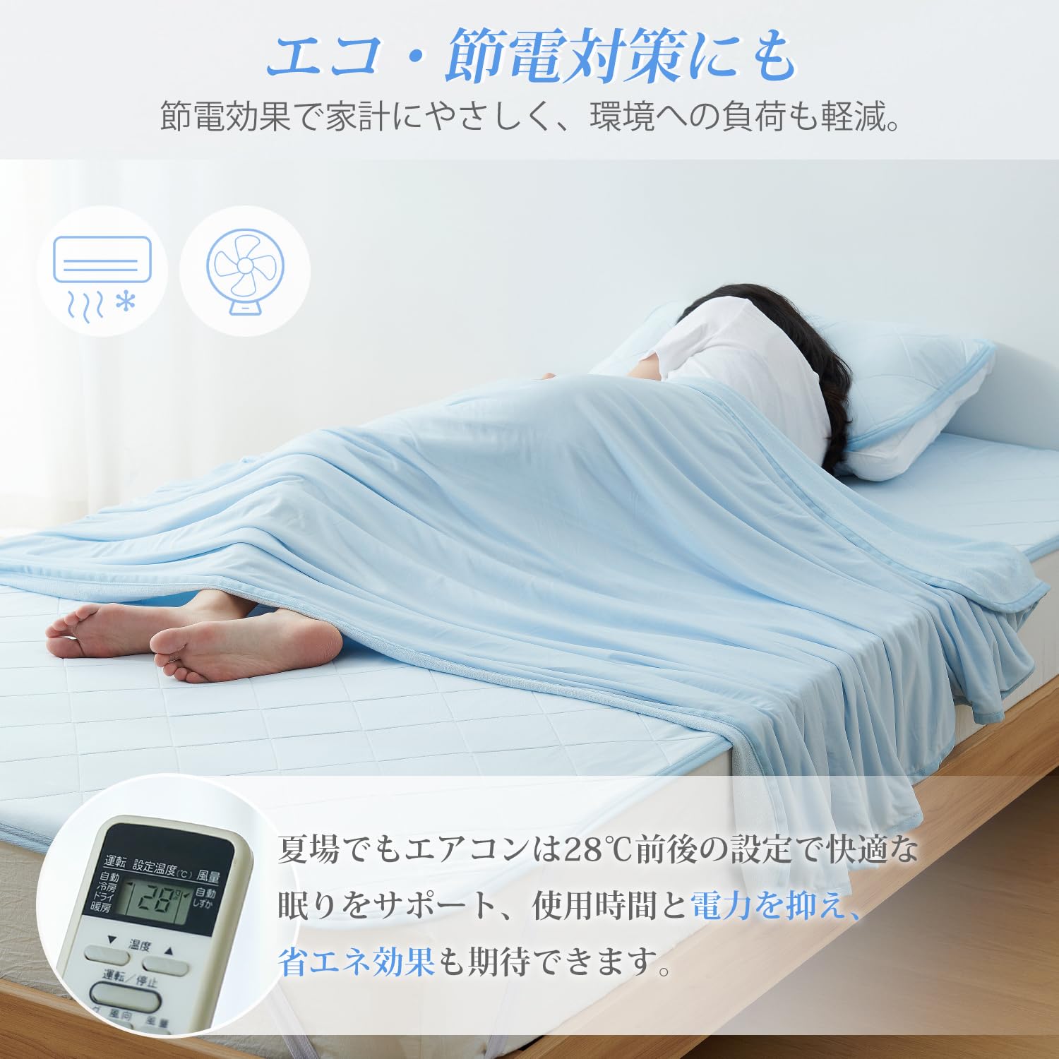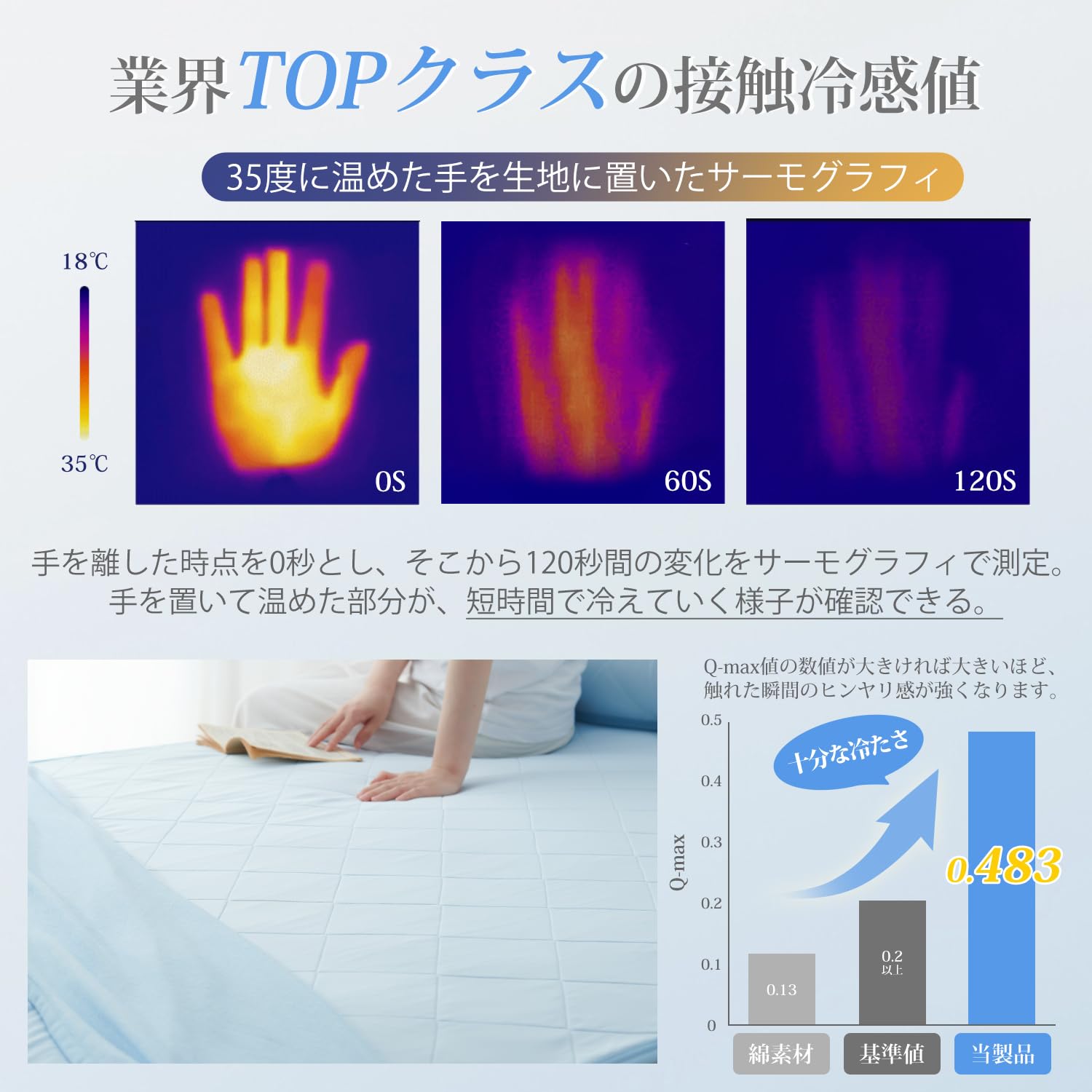「圧倒的な冷感性能―Q-MAX値0.4超え」Q-MAX値とは、肌に触れた瞬間の“ひんやり感"を数値化したもの。本製品はQ-MAX0.4を超える高水準で、ひと触れでしっかりとした冷たさを実感できます。冷房や扇風機と併用すれば、より強力な冷感効果が得られます。