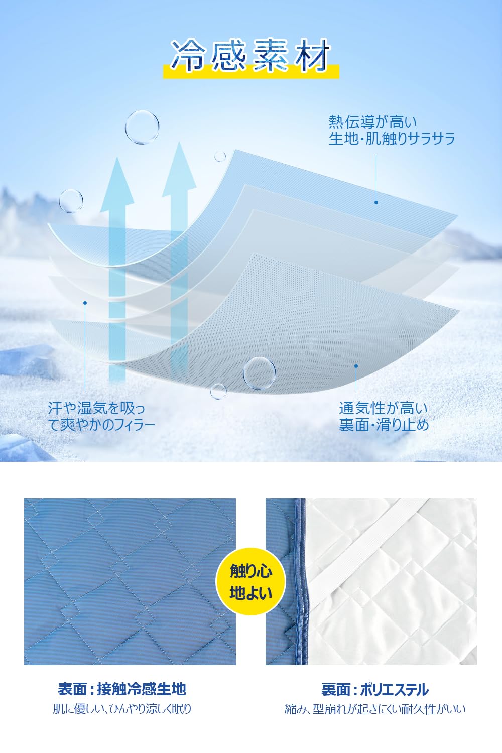 【冷感で夏も快適】高熱伝導性の冷感敷きパッドは、触れた瞬間に涼しさを提供します。100%冷感素材を使用した表地は、夏の暑い夜も心地よく過ごせるよう設計されています。この冷感敷きパッドは、シングルサイズで、寝室のベッドや敷布団にぴったりです。特に、冷感シーツや枕カバーと組み合わせると、更に冷却効果を実感できます。エアコンと併用することで、電気代の節約にも繋がり、エコで快適な夏を過ごせます。素材はナイロン75%、ポリエステル25%(表地)、ポリエステル100%(裏地・中綿)で、耐久性と通気性に優れています。この冷感敷きパッドは、夏用の寝具として最適な選択肢です。冷たい感触を持続させるクール敷パットで、寝苦しい夜も快適に眠れます。