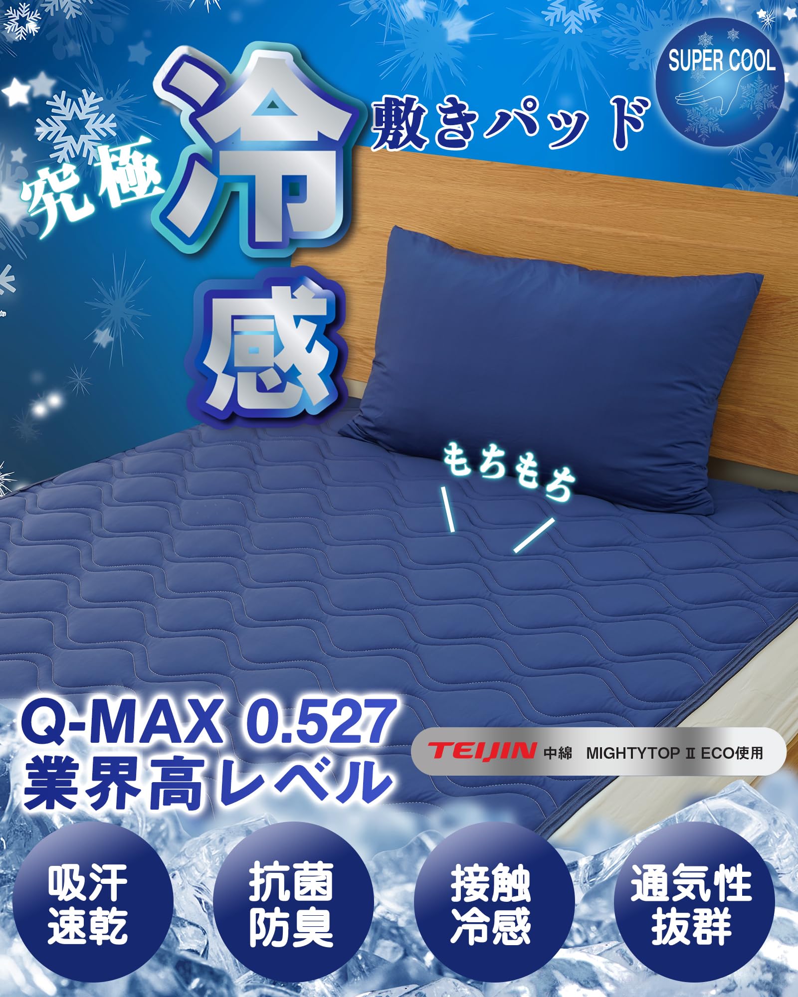 【究極冷感敷きパッド!】敷きパッドの表地には『強冷感』と『柔らかさ』を兼ね備えたスムース生地を使用。さらりとした触り心地で、暑い夜でも快適な眠りを提供します。第二層には透湿性不織布。 第三層には帝人の【マイティトップ Ⅱ】の中わたを使われ、抗菌防臭効果で、臭いや細菌の繁殖を抑えます。第四層には特別開発した繊維の「吸水速乾」中わたが湿気を素早く吸収し、迅速に乾燥させるので、寝汗や不快な湿気を防ぎます。裏地には「爽やか」なリサイクルピーチ素材を使用し、快適な眠りをサポート。