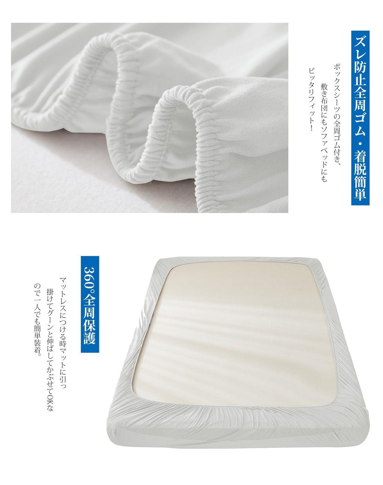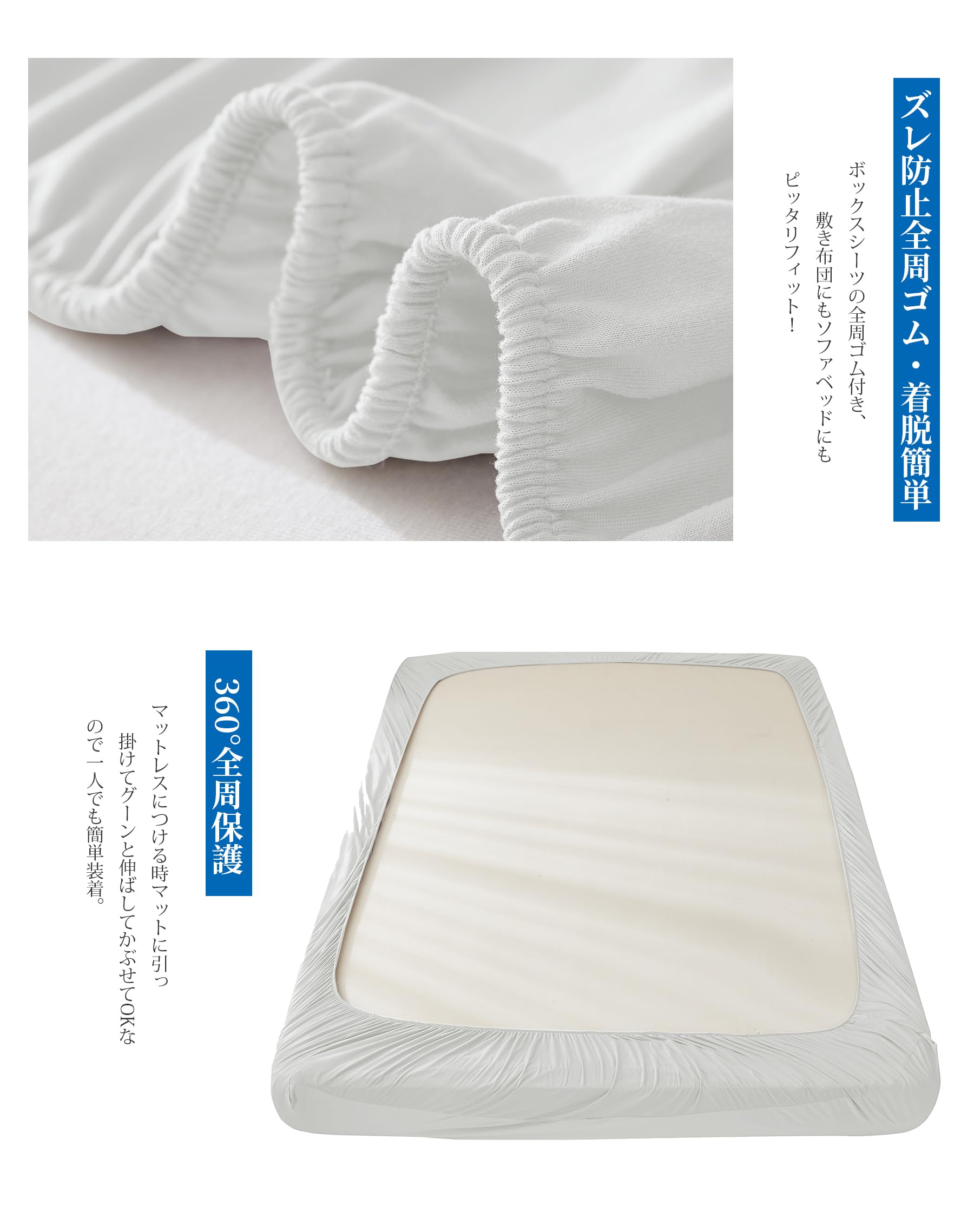 【伸縮性抜群、付け外し簡単】「3Dストレッチ」特性があり、タテにもヨコにも伸びるので、様々なサイズのマットに適用できます。 シワにならずにぴったりフィット、アイロンいらずキレイなベッドに変身するボックスシーツです。 手間なく簡単に装着できます。