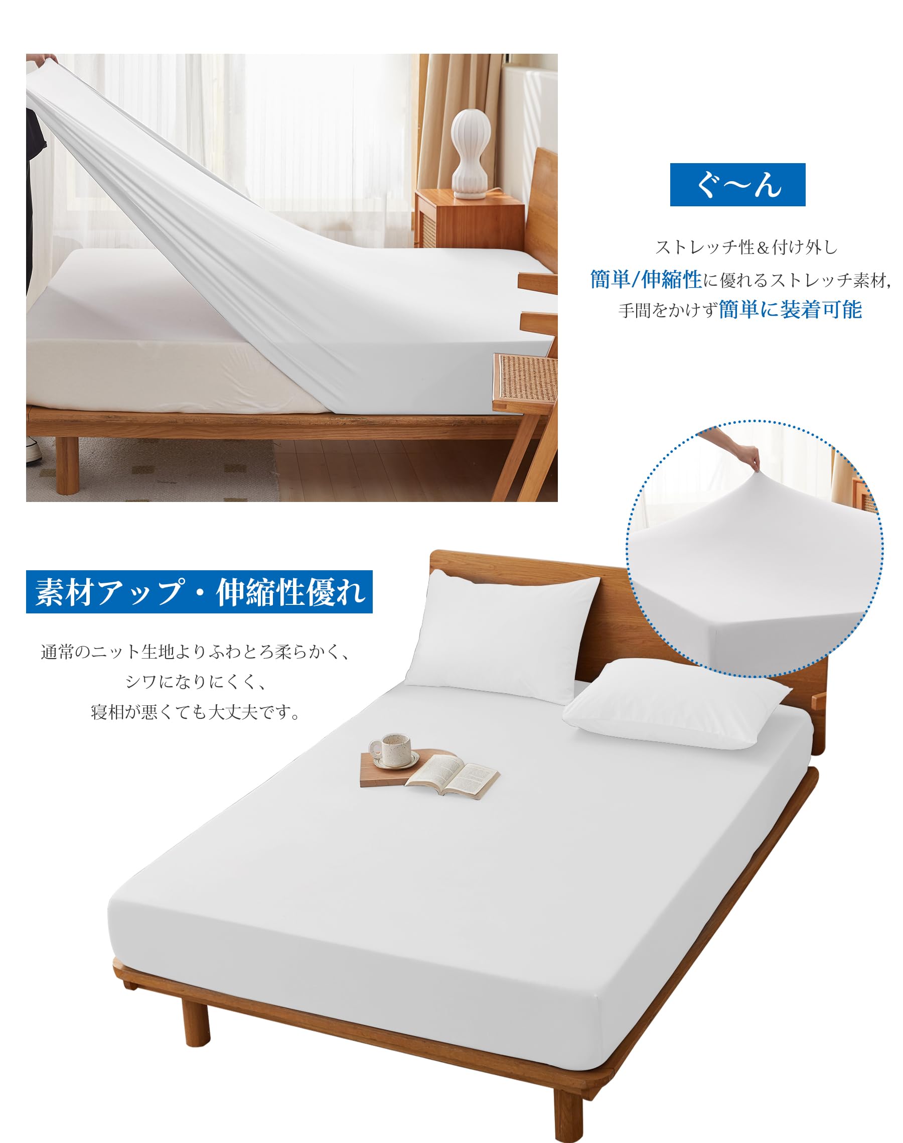 【全周ゴム保護】伸びる生地、全周保護。全周ゴム付け、マットレスを全面的にカバーし、シワが出にくく、着脱も簡単。全周に38cmのズレ防止強化ゴム付きボックスタイプなので、厚さ3~35cmのマットレスにピッタリとフィットします。ベッド用 / マットレス用 / 敷き布団に、いろいろ使えます。着脱も簡単、寝相が悪くても大丈夫です。