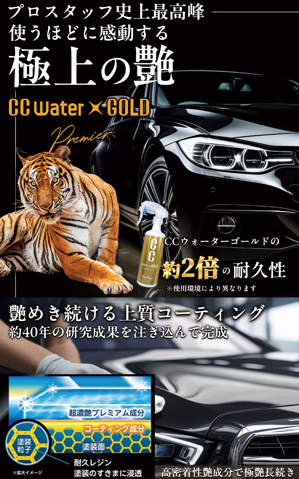 ボディーにスプレーして拭くだけで圧倒的な艶感・高撥水が得られる、CCウォーターゴールドの性能をさらに高めたプレミアモデルのコーティング剤です。