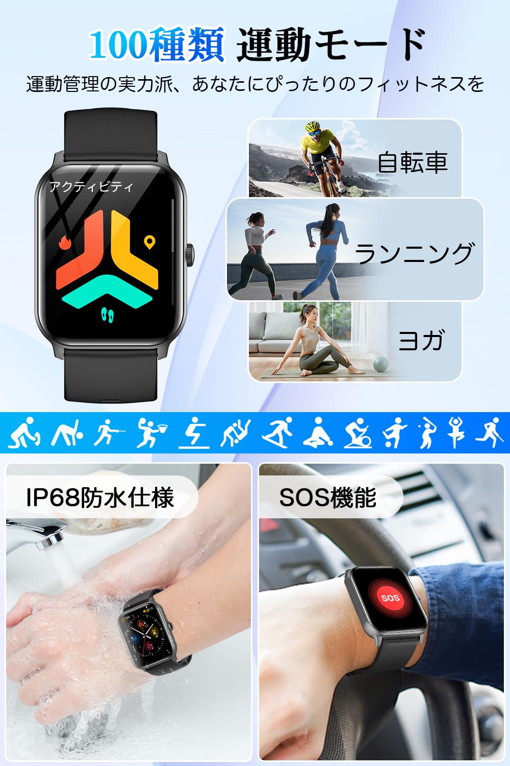 スマートウォッチ【2025年業界進化モデル】iPhone対応 アンドロイド対応 最新Bluetooth5.4 通話機能 音楽再生 超大画面 活動量計 腕時計 100種類の運動モード スポーツウォッチ IP68防水 アラーム SMS/Twitter/Line通知 SOS機能 メンズ レディース プレゼントに最適