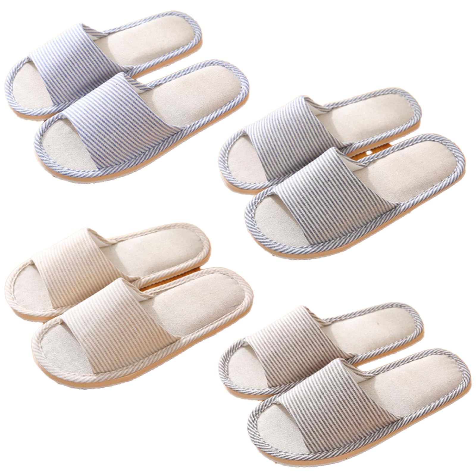 【来客用に最適!前開きで快適なスリッパ《4足セット》】おうちの“おもてなしアイテム”として大活躍!通気性抜群の前開きデザインで、履き心地も清潔感もあります。 ブルー・ネイビー・ベージュ・ブラウンのナチュラルカラー展開で、どんなインテリアにも馴染みます。やさしいストライプ柄とふわっとしたインソールで、足元を優しく包み込む快適仕様。急な来客時もサッと出せて便利です。