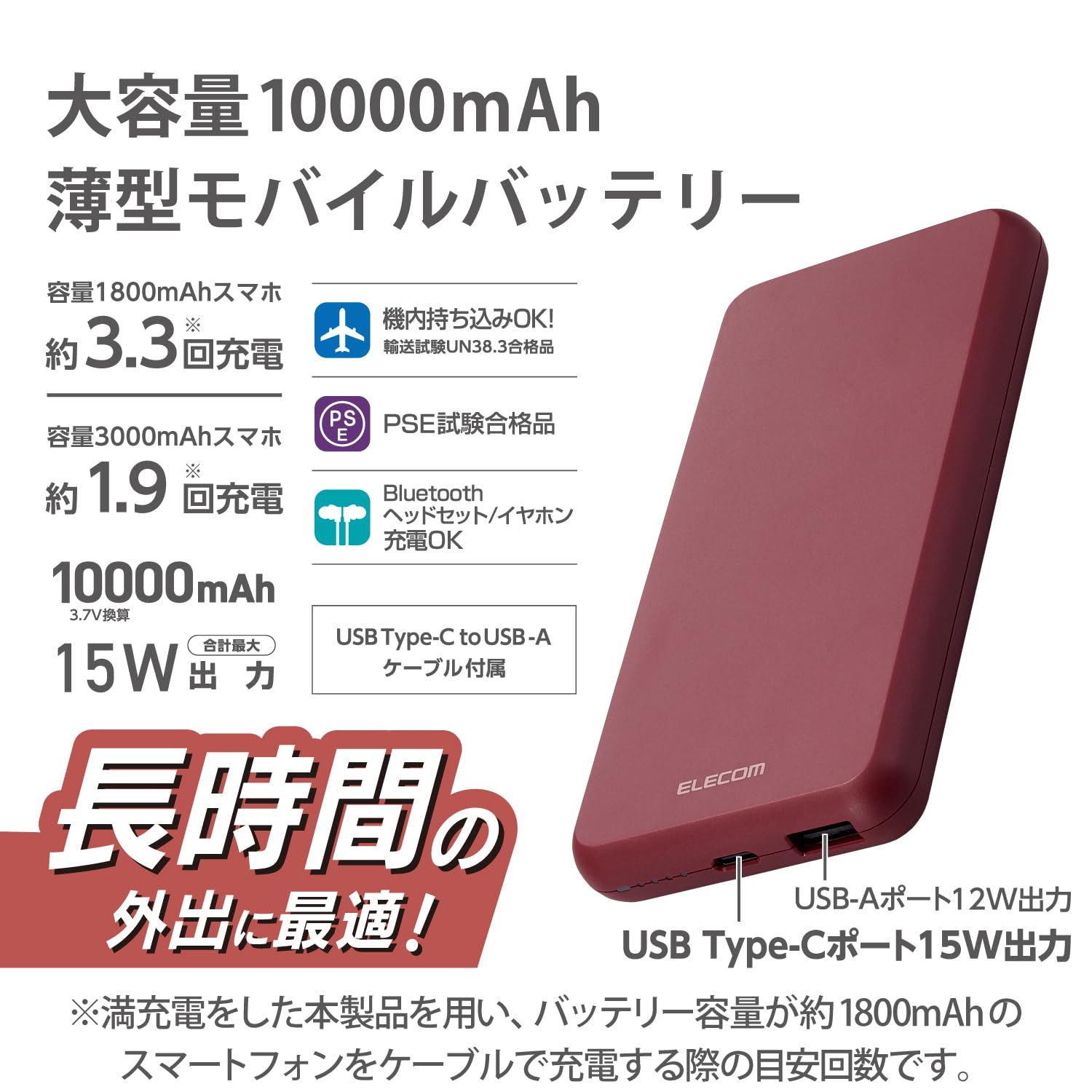 エレコム モバイルバッテリー 大容量 10000mAh 15W 2台同時充電 出力2ポート (Type-C/USB-A) 入力(Type-C) 【 iPhone SE3 / 13 / 12 / iPad/Android 各種対応】 レッド DE-C38-10000RD