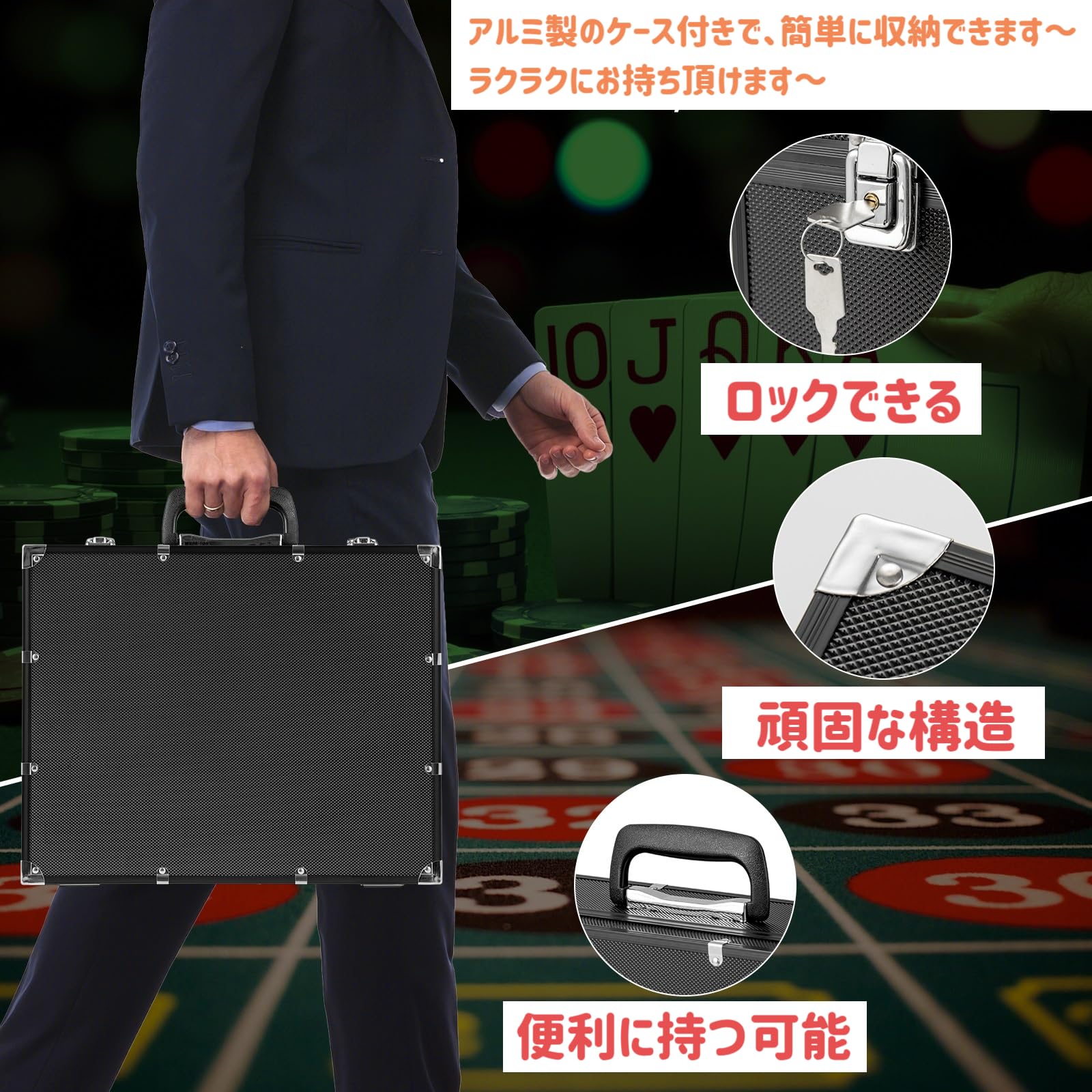 *セット内容:チップx300枚;ケース/ブラックx1個;マットx1枚;カードシューx1個;カードシャッフラーx1個;サイコロx5個;トランプx2組;ディーラーx3個;鍵x2本。