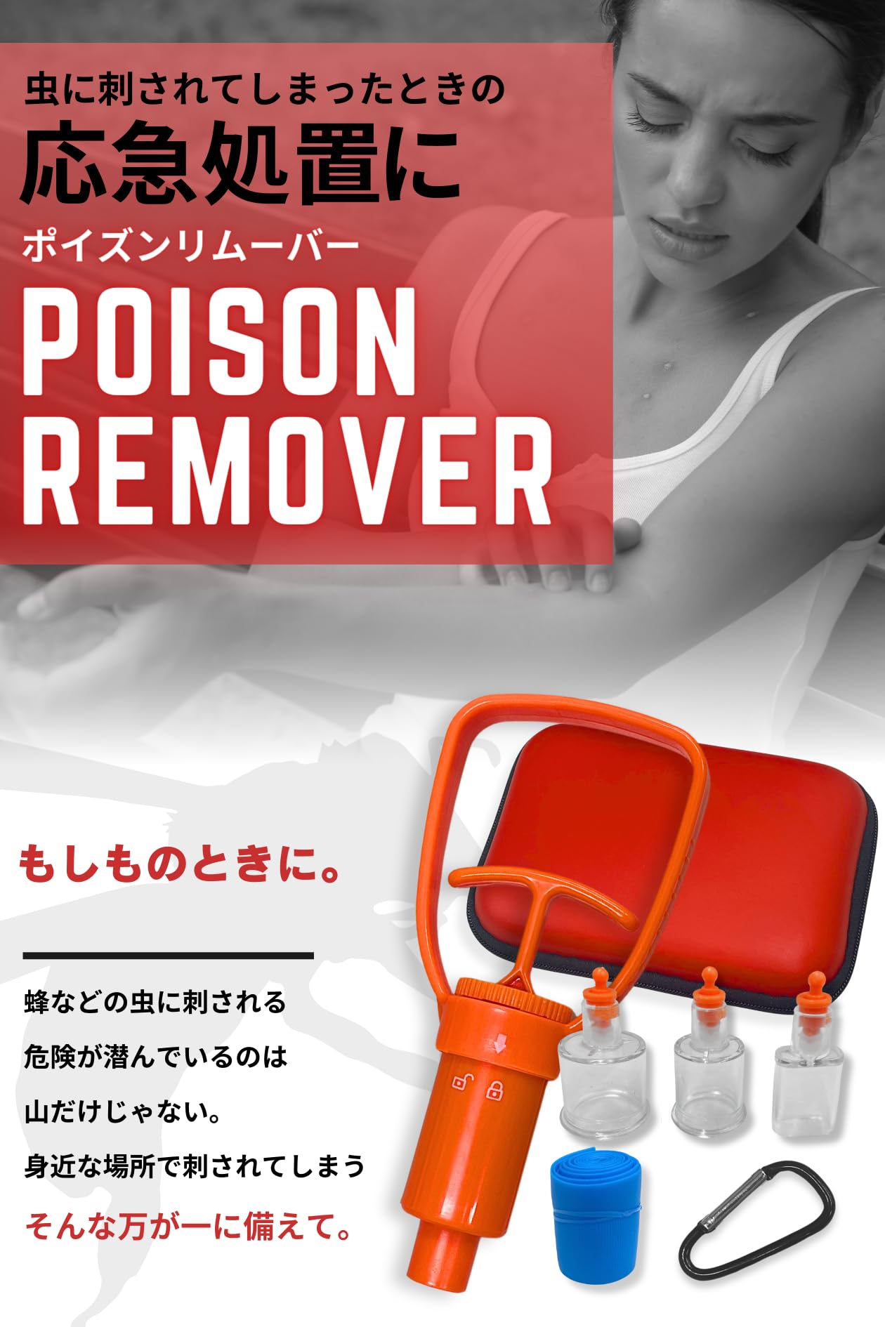 【ポイズンリムーバーって?】刺されたり咬まれたりしてしまった時に、毒の刺激や酵素毒、毒針が体内に残らないように患部を陰圧してそれらの毒を吸い取るアイテムです。病院へ行くまでの応急手当を目的としています。登山やキャンプ、ハイキングといった野外で行うアウトドア・アクティビティの時には何が起こるか分からないので、キャンプ用品や登山用品の必須品ですが、ここ数年間で一般の方へも認知が進んでいます。