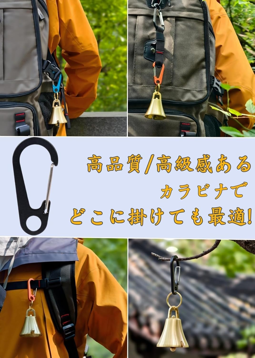 Point6「簡単なお手入れ」耐水性と耐久性に優れた真鍮製とアルミ製カラビナ、汚れや雨にも強く、過酷な環境下での長期使用に対応します。少しの衝撃では変形しません。障害物の多い山の中でも問題なく鈴の音を鳴り響かせます。ハイキング、トレッキング、渓流釣り、キャンプ、登山はもちろん、通学や散歩など、多彩なアウトドアシーンや日常生活でも活躍してます。