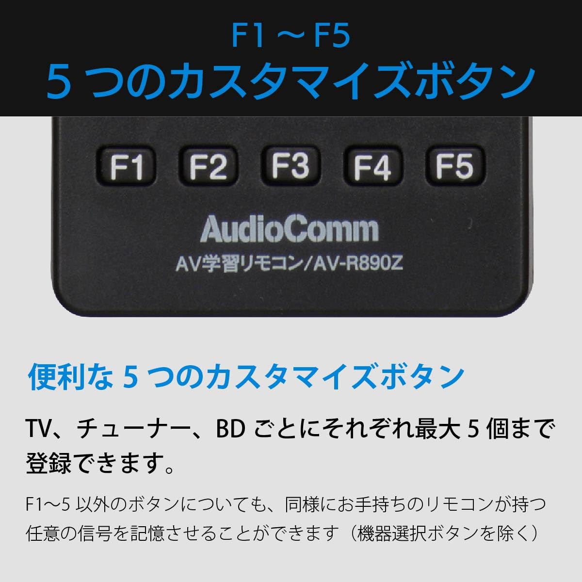 【 特 長 】 ◆最大3台のAV機器を操作できる ◆テレビ対応メーカー36社、チューナー対応メーカー23社、BD/DVD対応メーカー34社 ◆各メーカーの操作信号を登録済み、メーカコードを設定するだけ ◆学習機能で未登録の操作も読み取り記憶、便利な5つのカスタマイズボタン メーカーコードを設定しても使用できない操作がある場合に、対象機種のリモコンを利用して操作信号を読み取り記憶して操作させることができます。(各機器用に5つあるカスタマイズボタンを使用)また、TV、チューナー、BDボタン以外のボタンもすべて学習機能に割り当てることができます。