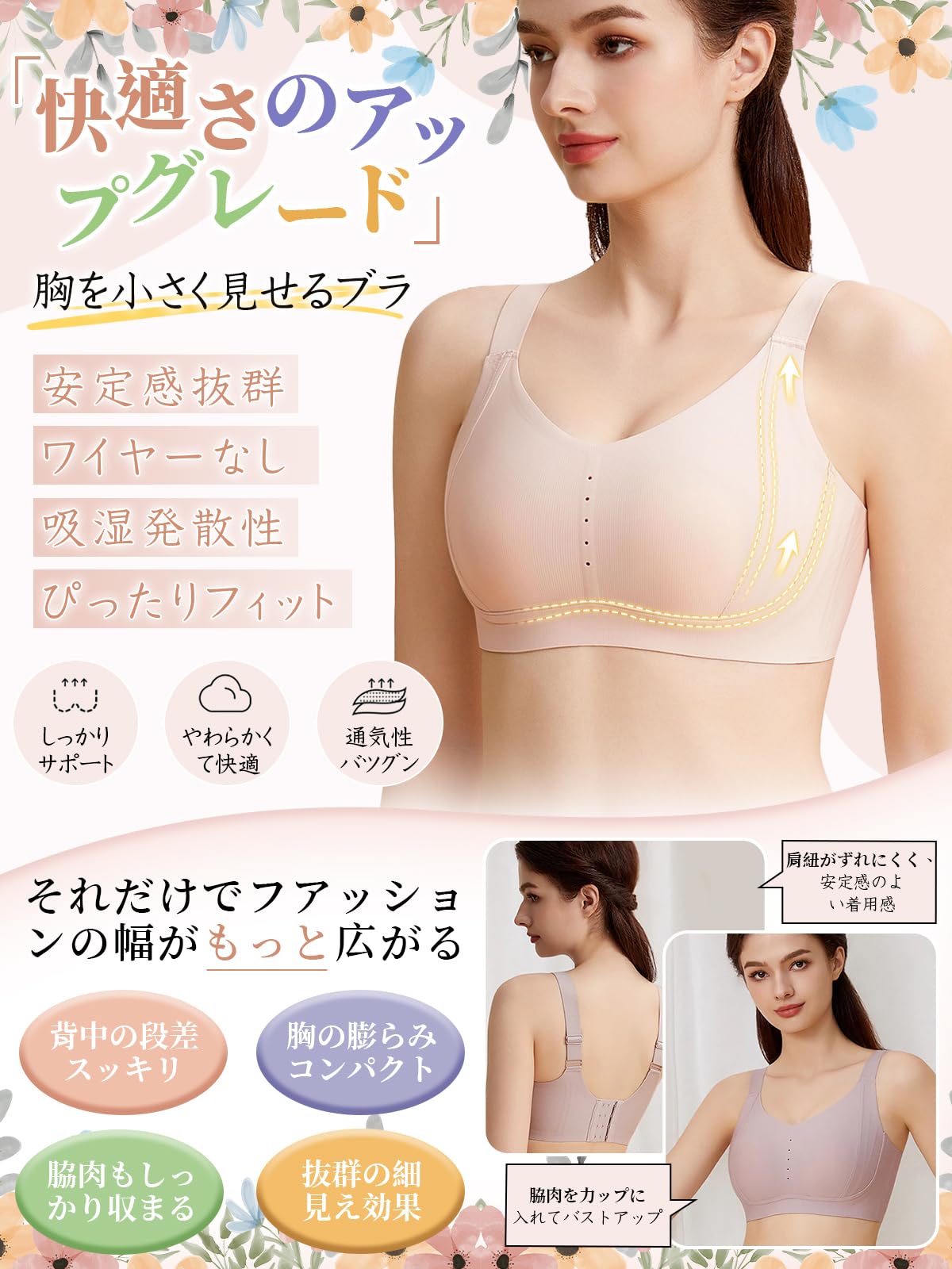 【2022最新】[veimia] 胸を小さく見せるブラ 小さく見せるブラ ノンワイヤーブラ 大きいサイズ 垂れた胸補正ブラ 通気孔の脇高ブラ【約2カップ小さく見せる】ぶらナイトブラ 揺れ軽減・見痩せ・ホールド力 シームレスブラ 24時間昼夜兼用