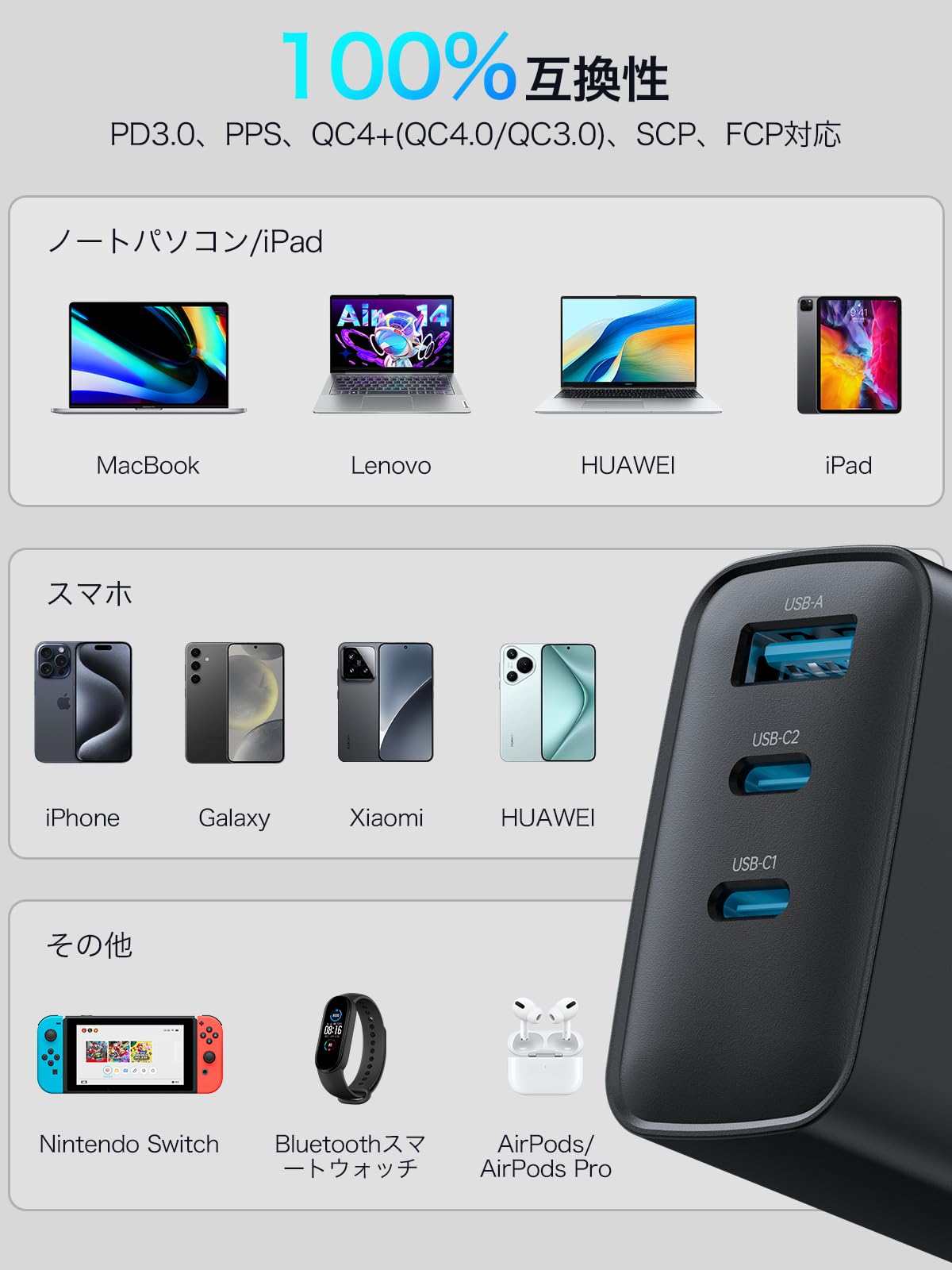 PD 充電器 65w【2025新設計・超軽量・超低温】安全で低温 折りたたみ式プラグ Type C 急速充電器 タイプc USB-C スマホ PSE認証済み 出張・旅行 PD3.0/QC3.0/PPS/SCP規格 MacBook/iPad/iPhone 16/Android その他機器対応