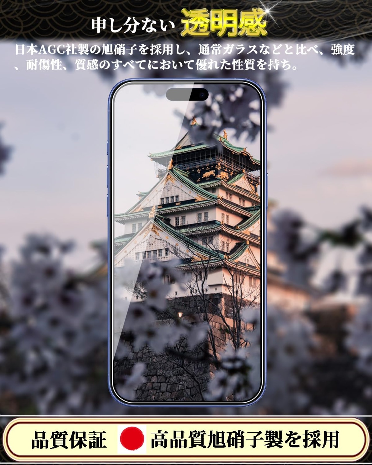 【旭硝子素材採用!対応機種】iPhone 16 ガラスフィルムは日本製の旭硝子を素材として採用し、業界最高レベルの9H硬度を持ち、耐衝撃性と耐傷性に優れています。衝撃吸収の特性により、転落とかの外力からスマホ画面への衝撃ダメージを最小限に抑えることができます。