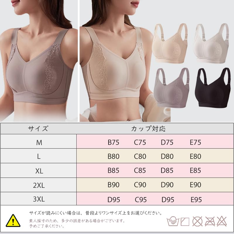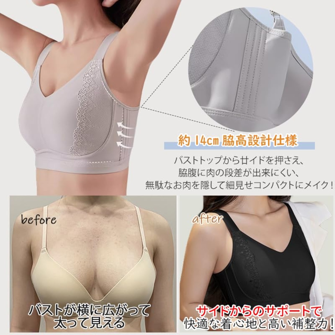 【揺れにくい安定感】バストをしっかりホールドする独自設計を確立。4段4列ホック付き、裾を広げたデザインは、補助乳房を巧みに集め、ストレッチ生地を使用しているので、しっかりフィットしてぐらつきにくく、痛くなりにくい!