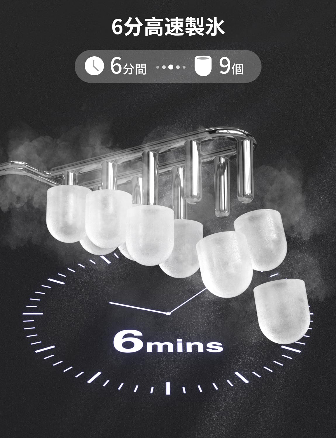 【6分高速製氷機】最短6分で9個のキャップ型氷が作れる製氷機は、1日に最大約12キロの氷を製造可能です。朝のアイスコーヒーから夜のカクテルまで、すぐに冷たい飲み物を楽しめ、食品を新鮮に保つ、腫れを和らげるアイスパックを作るなど、様々な用途に活用できます。
