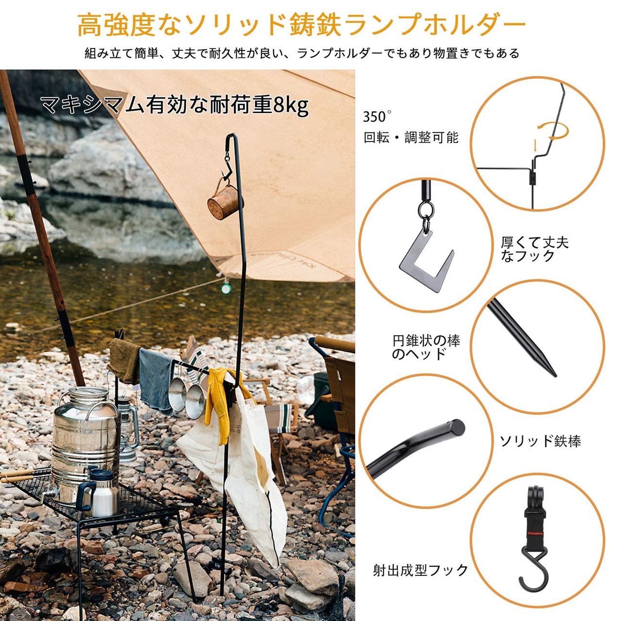 【安定性】多機能ランタンスタンドはシンプルな打ち込み式の2脚構造を採用し、優れた安定性を提供します。脚をしっかりと地面に打ち込んで固定されるので、簡単に倒れません。1脚単独で使用、2脚を合わせて使用も可能な両用ランタンスタンドです。一番上の「く」字型のポールが回転できます。