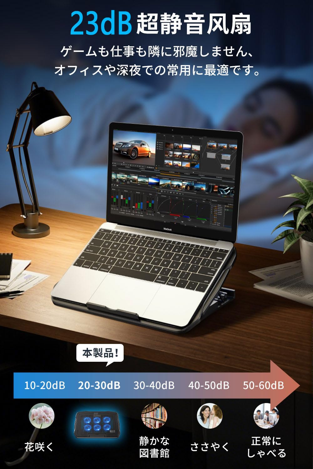 【23dp静音冷却ファン】6つの超静音冷却ファンが搭載され、かつ特殊羽根形状のデザインでスムーズな風の流れを作り、全面的に送風できるので、気温の高い時期には、ノートパソコンの放熱を改善させ、効率良く冷却でき、熱暴走によるフリーズや動作不良を防ぐ、製品の寿命を長く延ばすことができます。驚きの約48%の風量増・騒音減を実現!