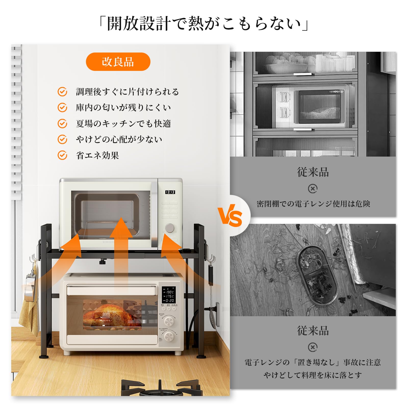 【余裕の奥行きと豊富なフックで、もっと便利に、もっと整頓!】棚板の奥行きはゆったりとした32cmを確保しており、トースターやコーヒーメーカーといったキッチン家電はもちろん、かさばる調理器具や収納バスケットなどもスムーズに置けます。さらに、側面には付属のS字フックが8個も掛けられる設計。ミトンや布巾、軽量の調理器具などを「吊るす収納」で効率的に整理でき、必要な時にサッと手に取れる快適さを実現します。