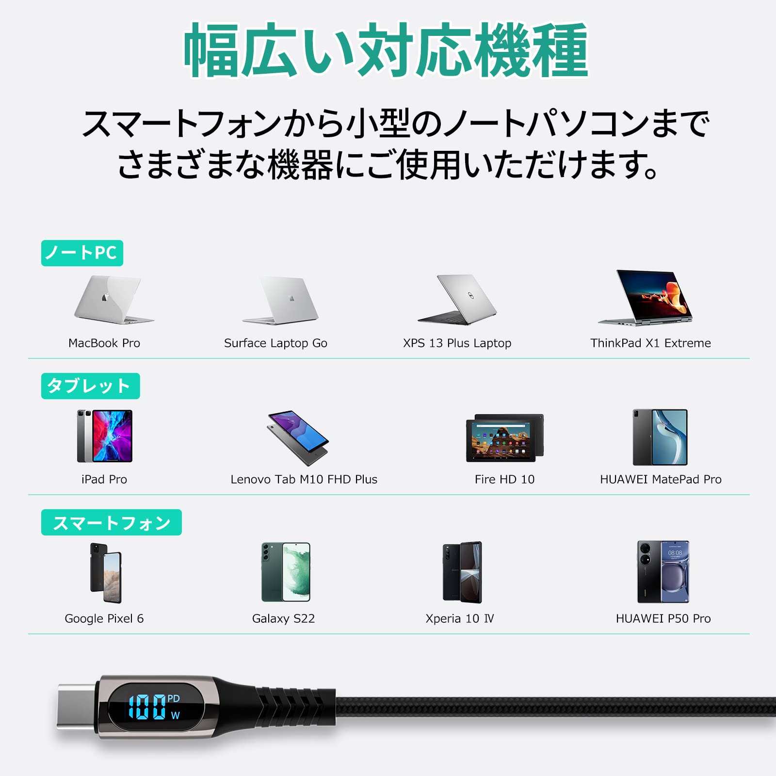 【高速充電】USB PD (Power Delivery)による最大100W (20V/5A)の急速充電に対応しています。Type-C端子搭載のパソコン、スマートフォン、タブレット、充電器やゲーム機器など、さまざまなUSB-C機器の充電に最適です。