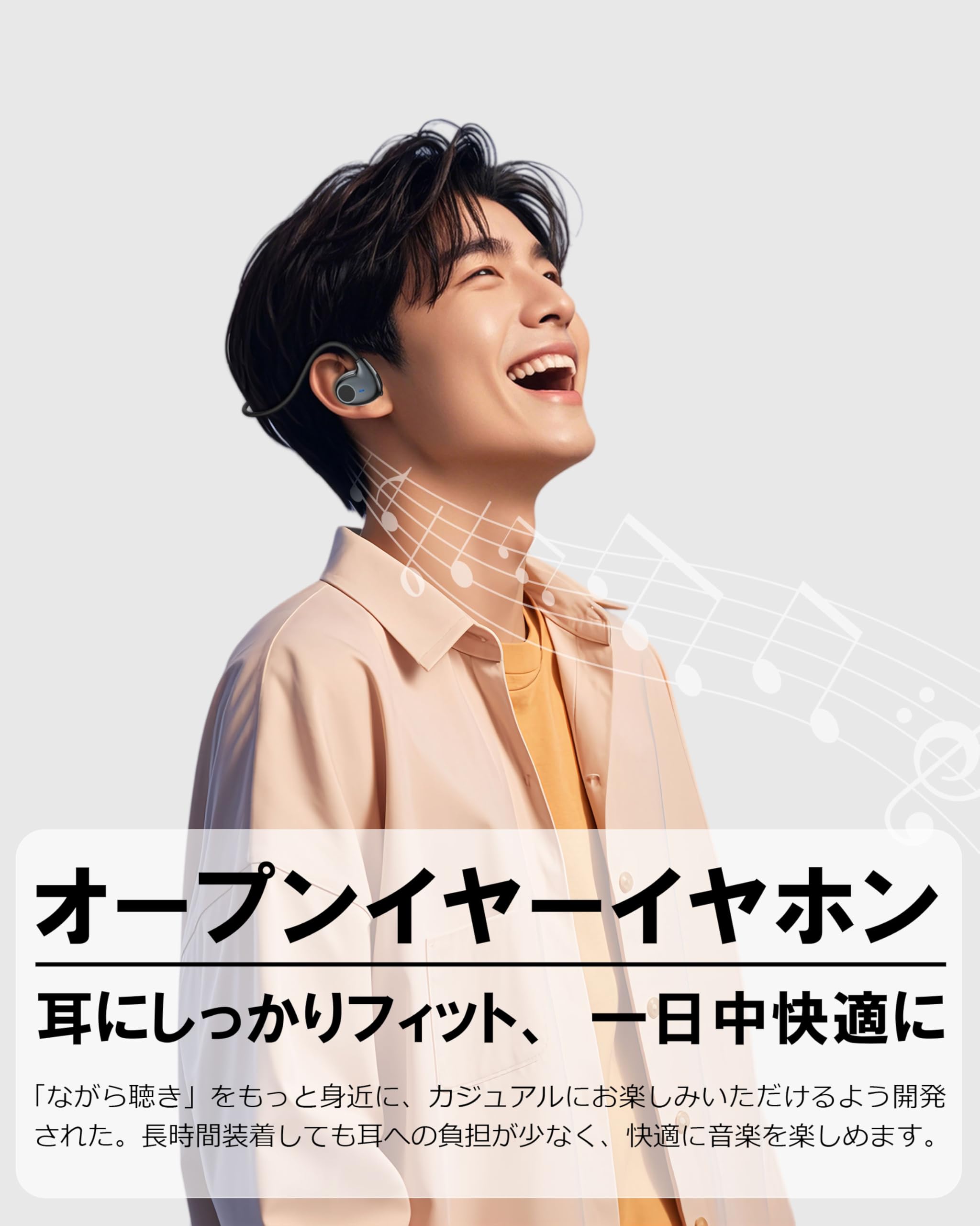【耳をふさがない空気伝導・簡単な操作】オープンイヤー型イヤホンは普通Bluetooth イヤホンのような閉塞感がないです。耳を塞がないで耳穴が開放されているから、耳に負担がかかりにくく快適にに使えます。骨伝導イヤホンのむず振動感や圧迫感がなく、振動や圧迫から解放できます。こつでんどう イヤホンのただ7時間ぐらいの連続再生と比べて、最大15時間連続再生可能!一日中に大好きな音楽を楽しめます!ヘッドセット イヤホンのボタン操作は簡単で、音楽の切り替え、電話の応答などができ、片手で簡単に操作でき、良好な操作性を実現しています。初心者でも簡単に使用でき、快適なユーザー体験を提供します。