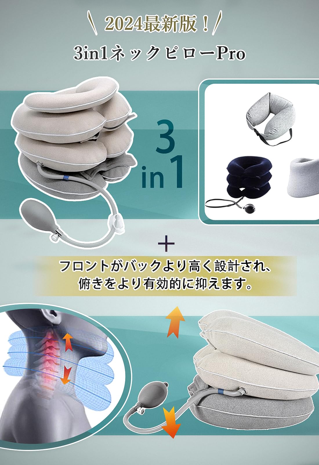 ■【全面的アップグレード、自宅で簡単セルフケア】】 類似商品に比べて、ネックストレッチャーは全面的なアップグレードを行い、三点セットの技術を採用しました。同時に、エアーネックストレッチャー、首コルセット、ネックピローの3つの機能を兼行してデザインされています。