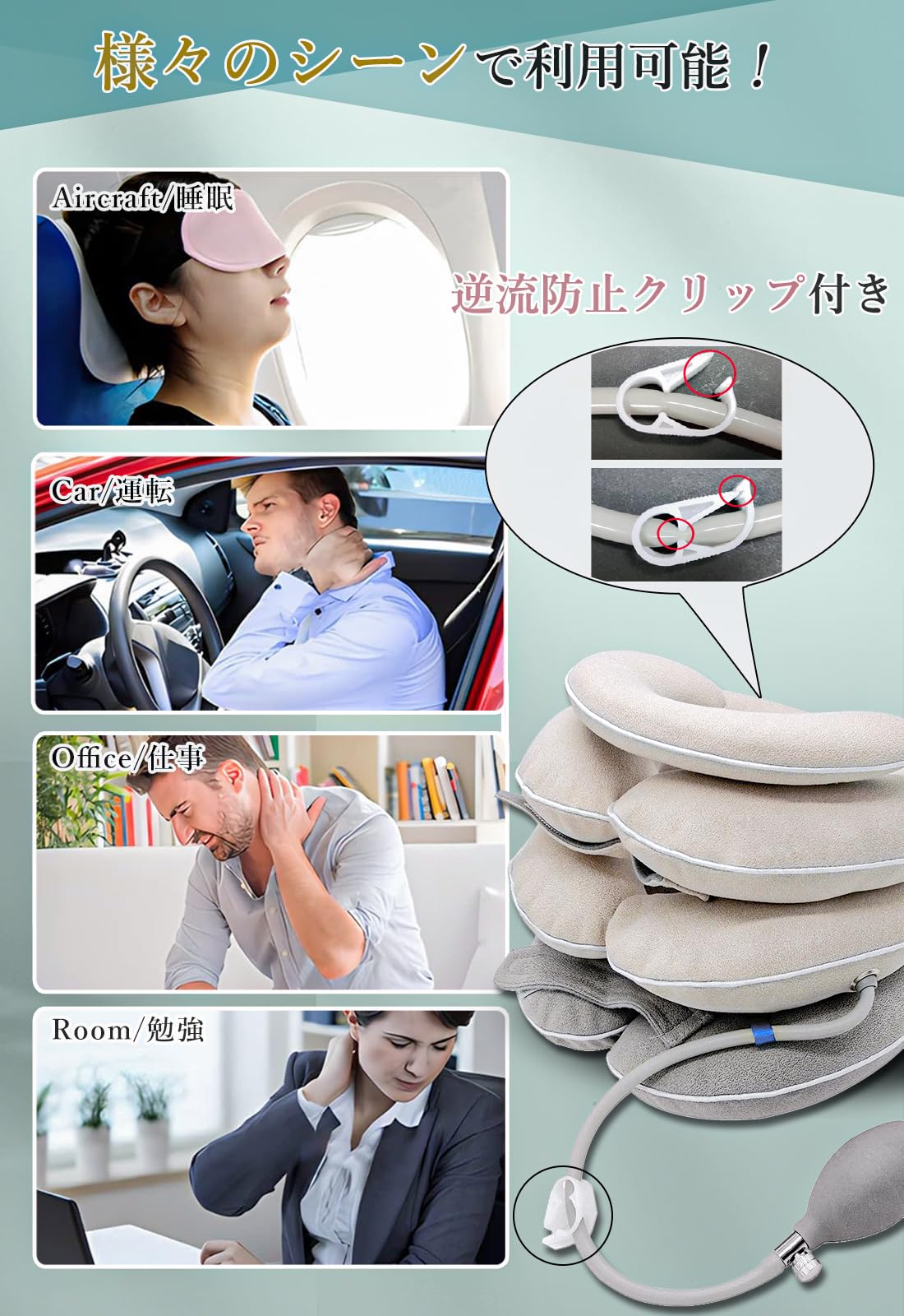 ■【コンパクトで持ち運びも簡単】首にセット→ポンプで空気を送る→ストッパーを留めるだけですので、どなたでも簡単にお使いいただけます。エアー式なので使いたい時だけ膨らませてください。使わない時は潰してコンパクトに収納できるので職場や旅行先にも携帯可能です。また、軽量なので、オフィスや家庭はもちろん、出先でも快適なくつろぎの時間をお楽しみください。『用途』として首コルセットの機能を果たし、首を柔らかく包み込んで伸ばしてくれます。『パッケージ』には1つの首サポーター本体、1つの空気入れポンプ、1つの説明書が含まれています。