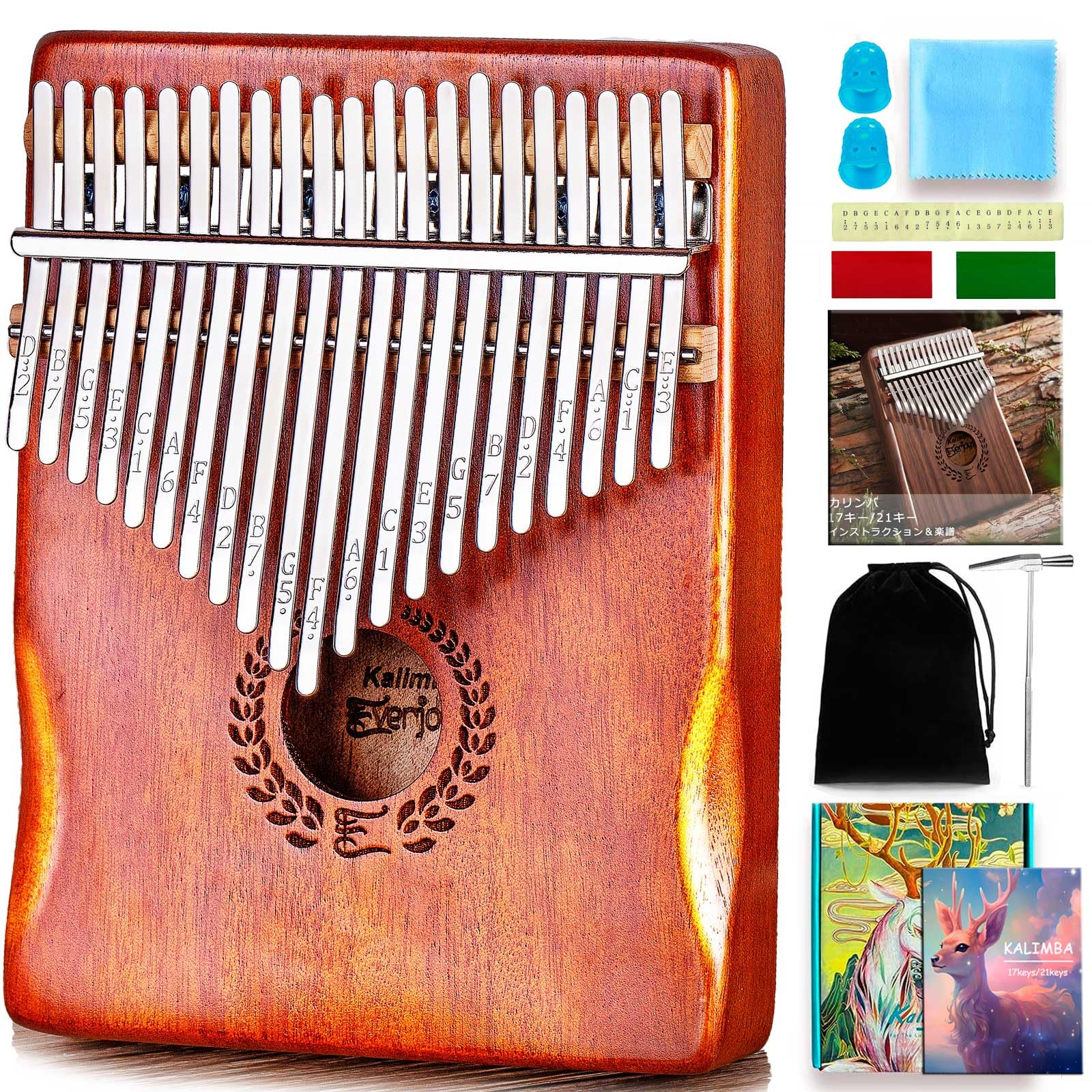 カリンバ 21 キー 初心者セット マホガニー チューニング済み 日本語学習指導 楽譜 音階刻印 調律済み 親指ピアノ 初心者向けの楽器セット付き親指ピアノ kalimba 子供 大人へのギフト