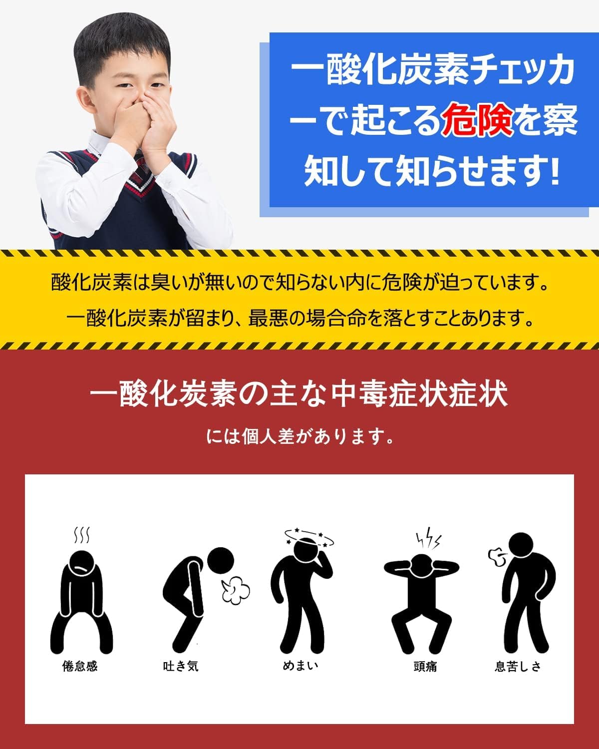 【デジタル表示&85dB大音量&日本語音声放送】赤いLEDが点滅し、LCD液晶ディスプレイを搭載していますから、暗い場所でも視認性抜群、空気中の一酸化炭素濃度、温度と湿度をデジタルで表示し、数値が読みやすいです。一酸化炭素警報器のアラームは最大85 dBまで鳴りますが、日本語音声で分かりやすく、警報音のお知らせを見逃すことはありません。濃度や発生している時間が一定の基準値以上の場合は赤色ランプが点滅し、換気を促す音声を発します。中毒の危険を防止することができます。