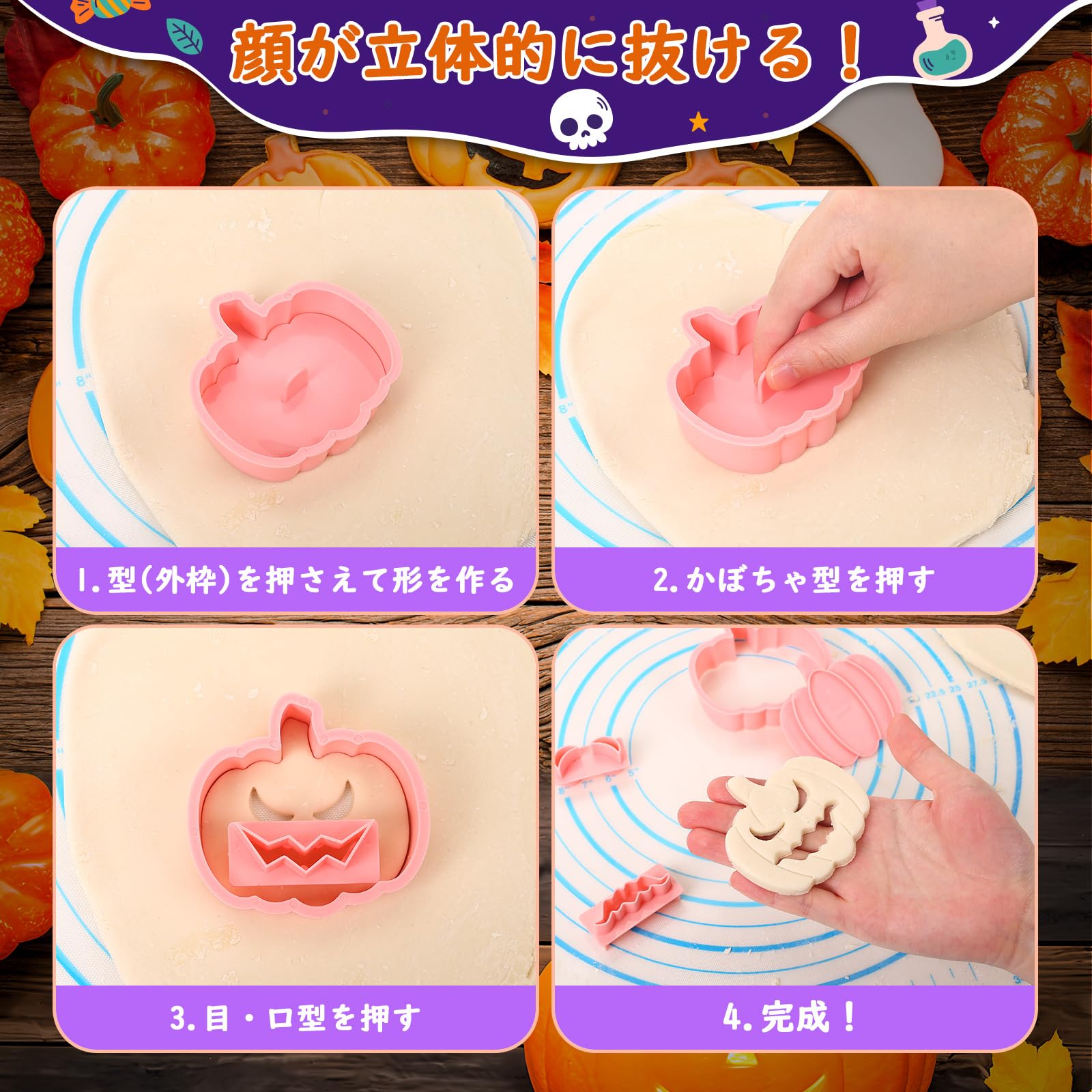 【17種セット】顔型抜き✕8個(両面模様、合計16種)&かぼちゃ×1個、材質:プラスチック、耐熱温度:70度、高品質スチロール樹脂を採用され、安全で簡単にかわいいクッキーが作れます。