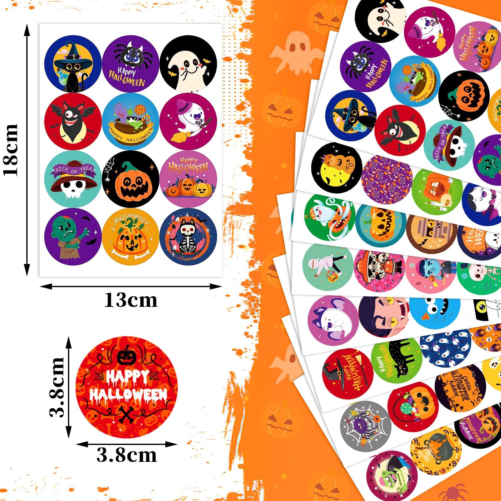 【大量】パッケージには、32シート、各シートに12枚、合計384枚のハロウィンシールがあります。量が多いので、ハロウィン装飾やハロウィン ラッピングにもじゅうぶんはずです。または、直径3.8cmの丸シールで、幅広く利用できます。