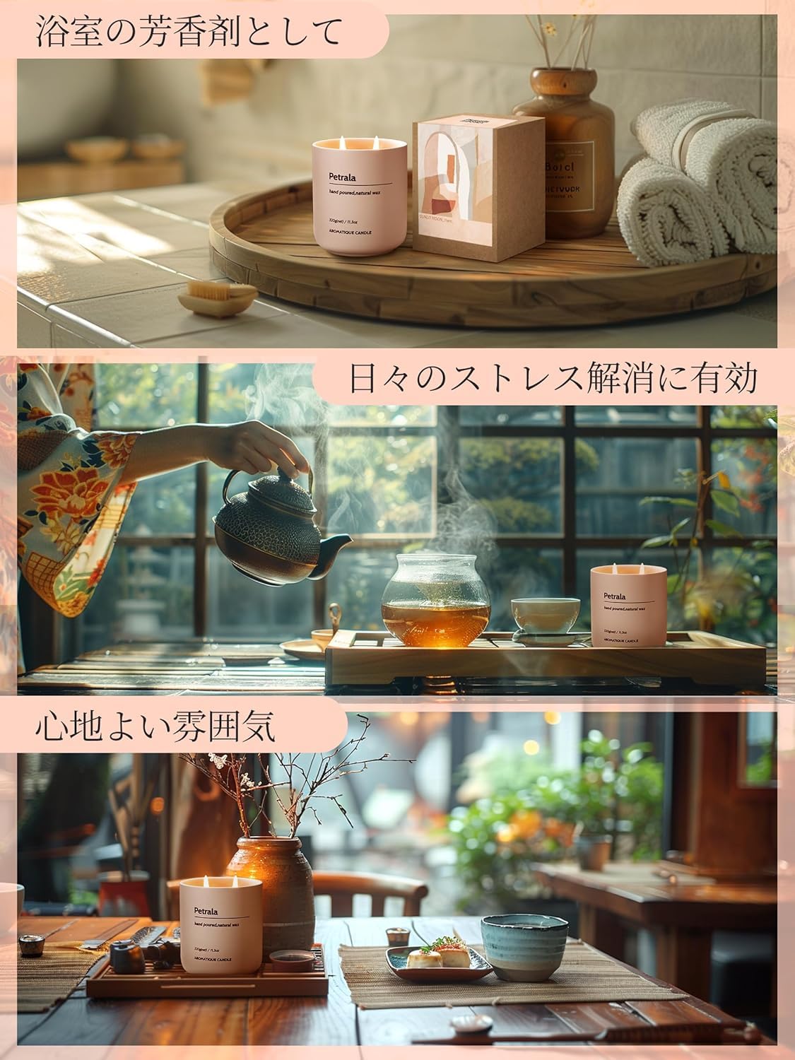 【燃焼時間長い】100%大豆ワックスキャンドルは320gで、約65時間の長時間燃焼を維持し、最高のリラックスをもたらします。ドイツから輸入された天然芯は無煙・無毒で、空気を汚染しません。人気な香りは心地よい雰囲気を演出し、ストレス緩和や気分を改善します。香りを楽しむ以外、燃焼時間長くて、停電時にろうそくとしても重宝します。