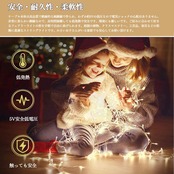 【8つ点灯モード・リモコン制御】USBプラグ上のボタンを押すと、ON/OFFと8種類モードの切り替えがで、ボタンを押すだけで簡単に切り替えが可能です。連統变更、波状変化、点滅变更、ちらつき变更、急速变更、低速变更、ドリーム变更、全点灯など8つの点滅パターンから好きな光り方を選んで、よりインパクトのあるライトアップを楽しめます。リモコン付きで8つの点灯モードをコントロール。オンオフやタイマー、点灯モードの切り替えを離れた場所からも操作できます。(リモコンをUSB端に向けてください、リモート距離は最大10mまで)光量調整機能付き、25%、50%、75%、100%という4つの明るさが調整できます。 【USB電源式Ledイルミネーション ライト】広範囲に装飾できるledストリングライト、10mの長さに100個の広拡散LED電球が付いています。光線が柔らかく鮮やかに光ってくてどの方向から見ても綺麗です、ウォームホワイトの発光色で、ロマンチックな癒しの雰囲気を作り出します。長さを気にせずたっぷり飾ることができ、屋内はもちろん、屋外でも利用可能、雰囲気を盛り上げて、お気持ちも楽々! 【USBタイプ・取り付け簡単·安全省エネ】USB式なので、イルミネーションライトは電池不要で、省エネで持ち運びも可能です。持ち運びに便利なアダプター、モバイル電源、PC、Macなど、USBポートを持つあらゆる機器が使用可能なので、大変便利です。デコレーションライトは高品質な純銅線と環境に優しい柔らかいTPV素材を採用し、柔らかく強靭で折れにくい。電球は環境に配慮した省エネLEDを採用しており、消費電力が少なく、数時間の作業で発熱や火傷の心配がなく、触っても安全です。 【モード記憶可能・タイマー機能】 LED電飾モードメモリー機能も付き、ライトの電源を切っても、次回も前回と同じ点灯モードで光ります。それに、ライトの電源をずっと接続すれば、毎日ほぼ同じ時点から点灯して約6時間後消灯し、約18時間後に自動点灯しると設定できるタイマー機能も付いています。 【防水・防塵仕様】LEDストリングスライトはIP65防水なので、屋外での使用可能です!庭や部屋やクリスマスツリーなど色々な場所で飾られます!クリスマス街にイルミネーションライトが飾られ、暖かい冬をロマンチックに演出する!クリスマス、ガーデン、結婚式、パーティー、キャンプ、ハロウィン、ホテル、バー、店舗、寝室、玄関、庭、壁、舞台、学校、ショッピングモール、披露宴ツリーなどの装飾としては大活躍です。ご注意:防水ですが、水の中に入れるなどの極端な環境でのご使用はできません。