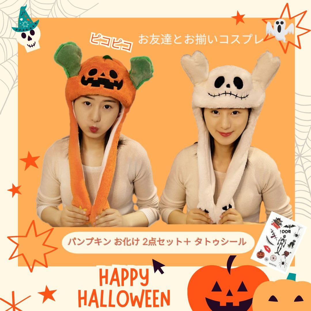 [wemitas] ハロウィン 仮装 コスプレ 大人 着ぐるみ 帽子 被り物 可愛い ピコピコ かぼちゃ パンプキン おばけ デビル 2点セット