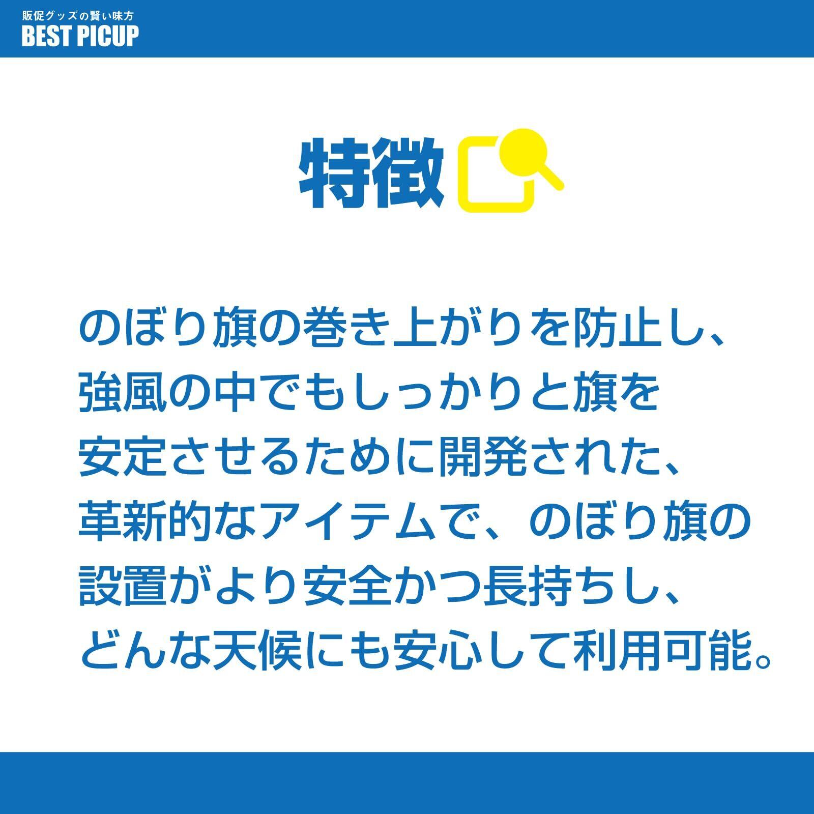 【特徴】のぼり旗の巻き上がりを防止し、強風の中でもしっかりと旗を安定させるために開発された、革新的なアイテムで、のぼり旗の設置がより安全かつ長持ちし、どんな天候にも安心して利用可能。