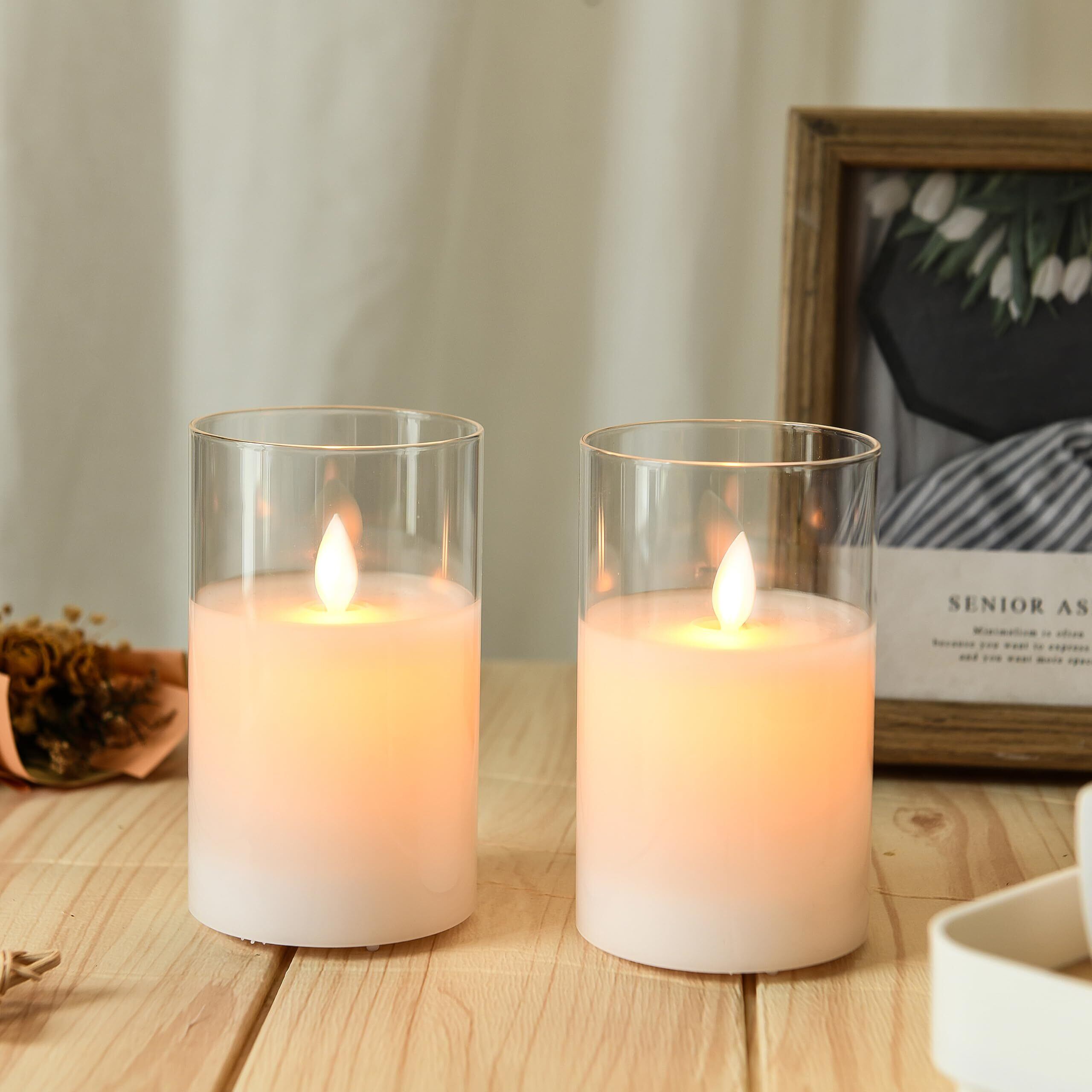【2点セット】AnnTec LEDキャンドルライト ロウソク 本物の炎のようにゆらめく 暖色光 火を使わない ゆらゆら揺れる 安全 省エネ 専用リモコン付き 明るさ調整 LEDロウソク LEDキャンドル 電池式 ガラス (直径7.5cm×高さ10cm) (ホワイト)