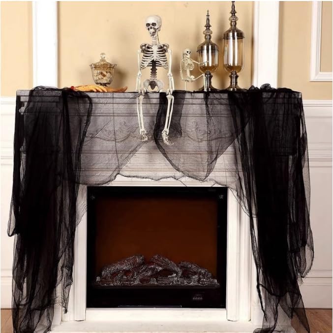 自由に飾り付け:非常に細かいメッシュの黒いガーゼ素材で、簡単に破れたり、カットしたり、ドレープしたりできます。黒いガーゼをスパイダーやコウモリ、そして他のハロウィーンの飾りと一緒に使うことで、より不気味な雰囲気を演出できます。