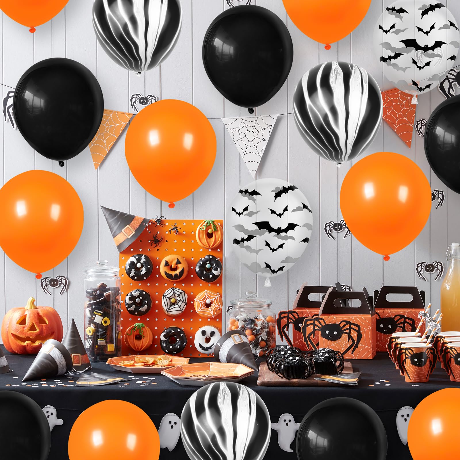 ■人気のラウンド風船50個入りのミックスバルーンセット。鮮やかなブラックとオレンジ、メノウ柄、コウモリ柄の配色はハロウィン限定で、目を惹くカラーがホリデームードを盛り上げ、パーティー会場を一気に華やかに演出します。