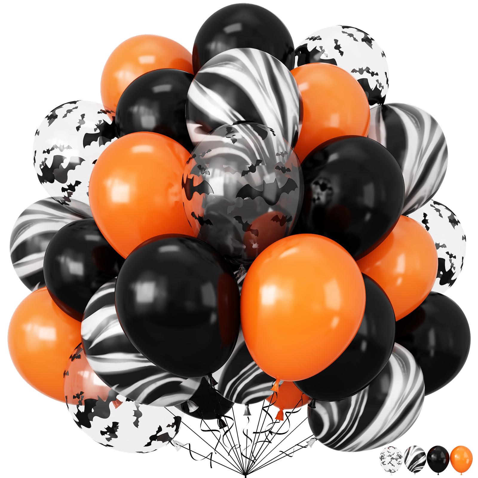 BTZO ハロウィン バルーン 風船 50個入 10インチ/12インチ 飾り付け HALLOWEEN パーティー イベント 学園祭 文化祭 お化け屋敷 店舗装飾 写真背景 お祭り ブラック オレンジ コウモリ柄 メノウ柄 ゴム風船 4色アソート