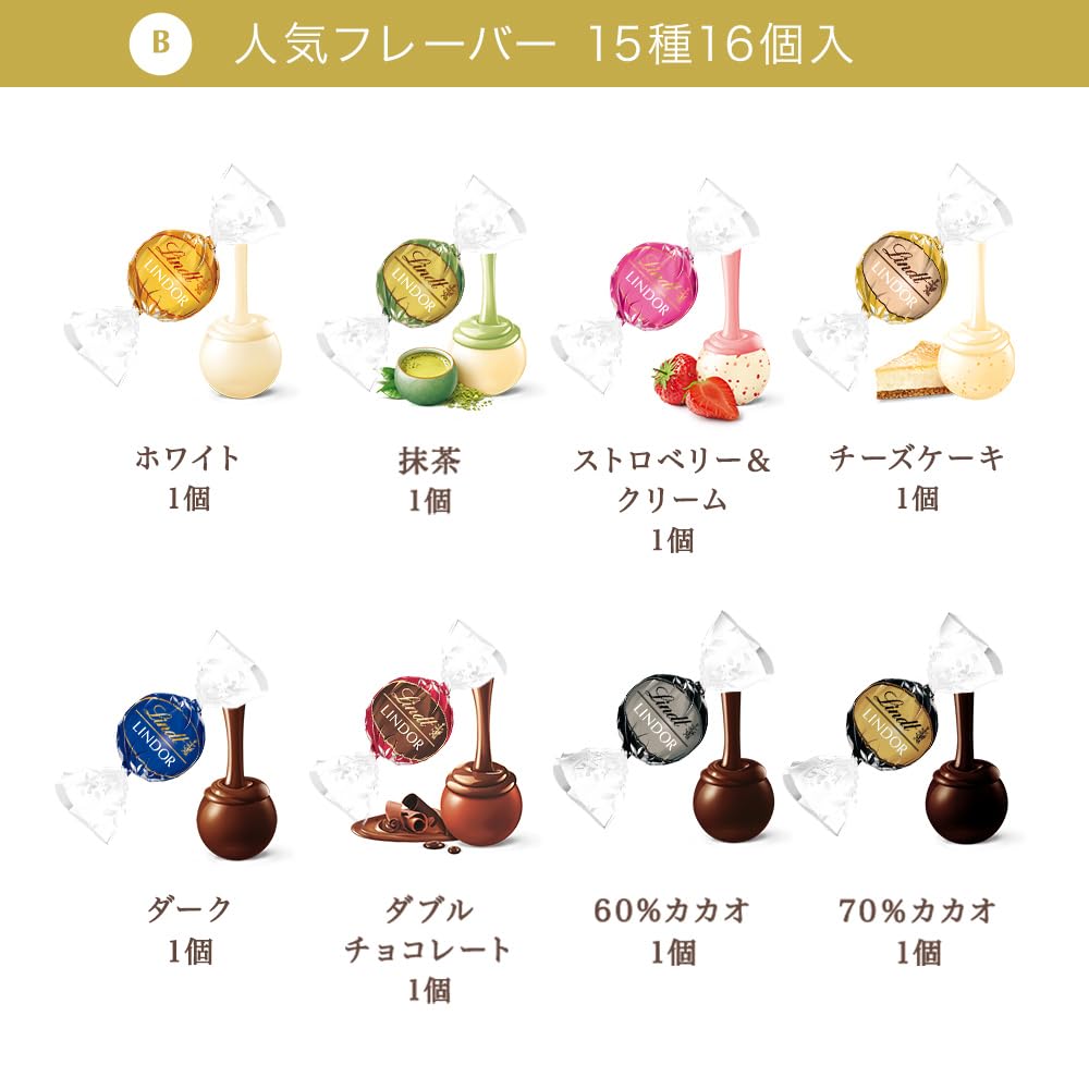 【内容量】16個 【内容】リンドール(ミルク 2個、ホワイト 1個、ヘーゼルナッツ 1個、ダーク 1個、ストロベリー&クリーム 1個、キャラメル 1個、60%カカオ 1個、70%カカオ 1個、ミルク&ホワイト 1個、抹茶 1個、ピスタチオ 1個、ソルテッドキャラメル 1個、ダブルチョコレート 1個、ブラッドオレンジ 1個、チーズケーキ 1個)