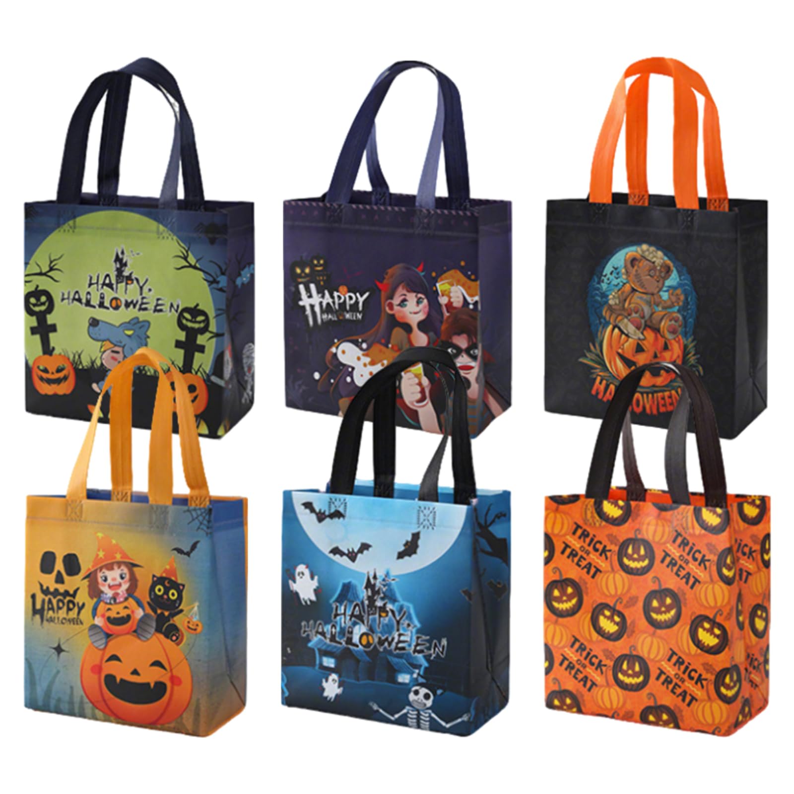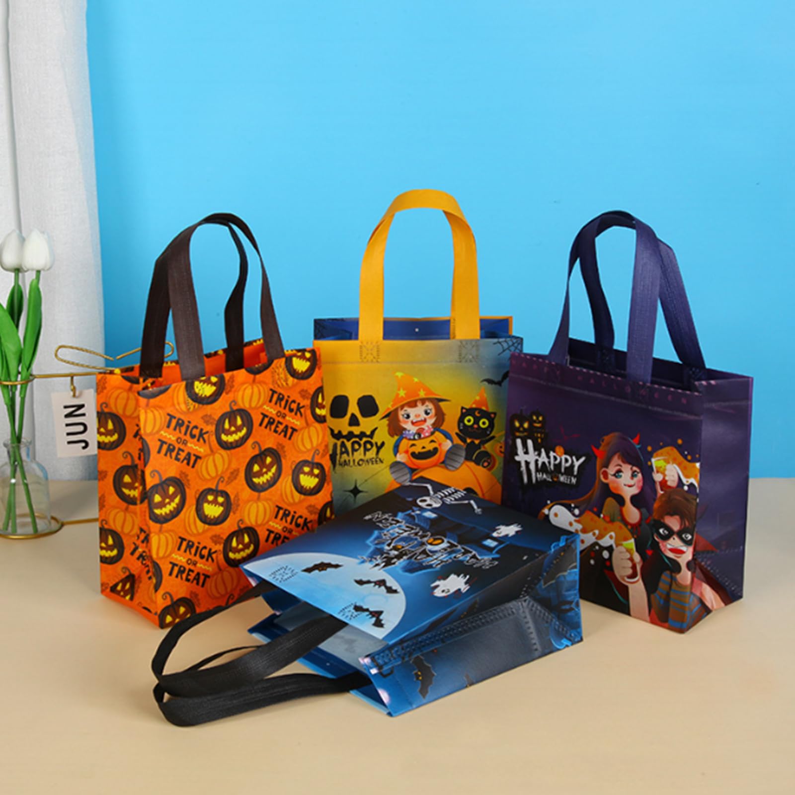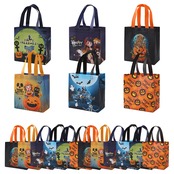 【ハロウィン限定ハンドバッグ】ハロウィン不織布バッグは、黒、黄色、オレンジ、青を背景に、魔女、コウモリ、幽霊、お城、カボチャなど、ハロウィンの定番柄をあしらっています。ハロウィンにぴったりで、華やかな雰囲気を演出します。