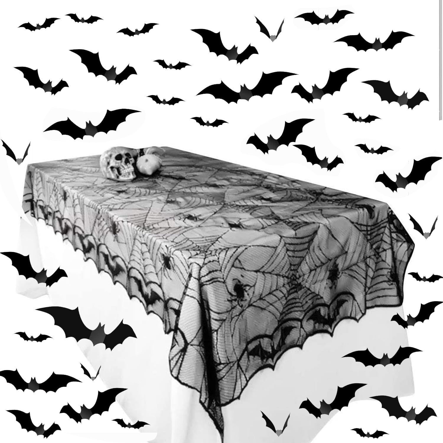 Forhomelife テーブルクロス 37点セット ハロウィン 飾り ブラック 蜘蛛の巣 レース 122x244cm ハロウィン コウモリ ステッカー 36枚飾り パーティグッズ インテリア 窓飾り お部屋飾り ハロウィン雑貨 デコレーション