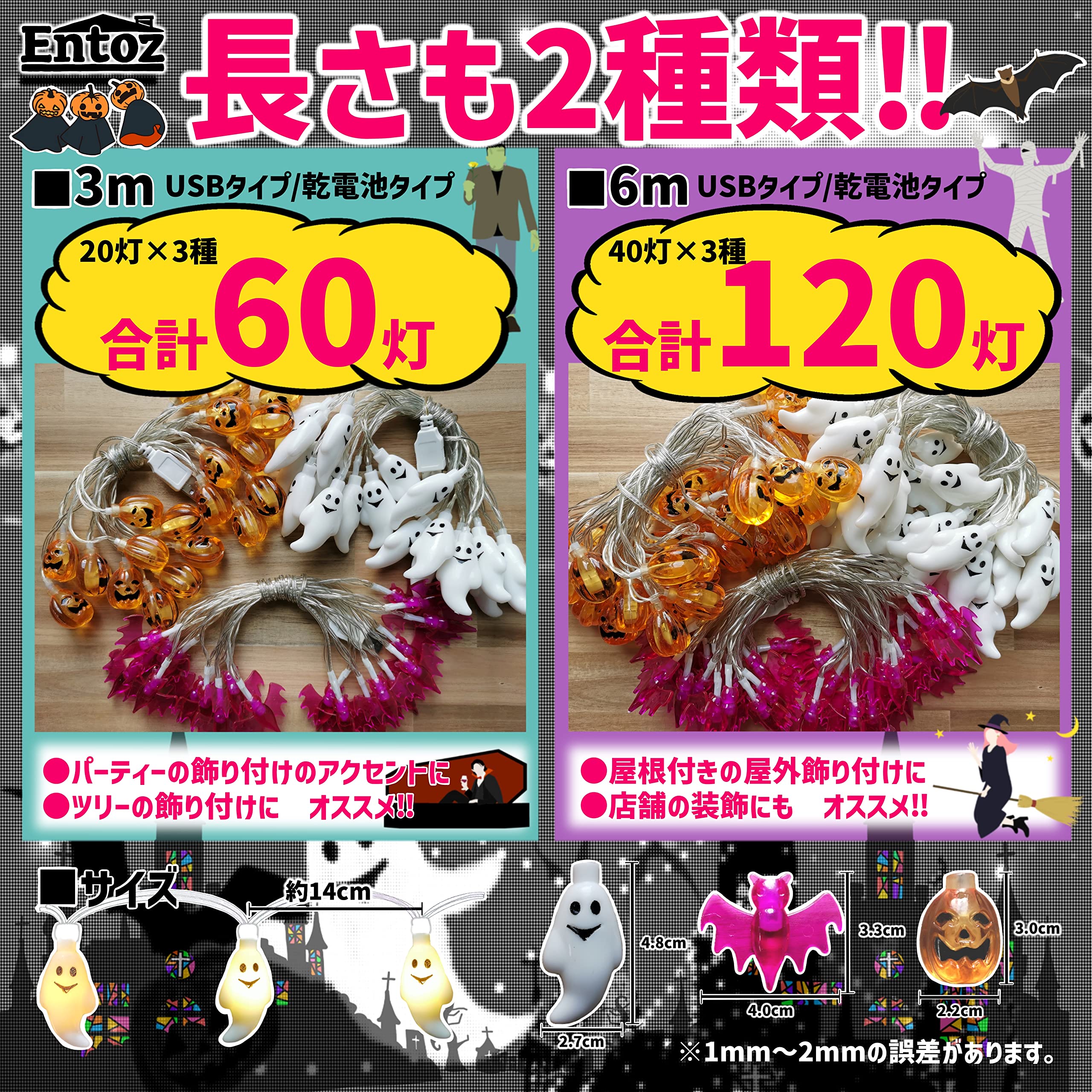 【毎年使える】『LED ライト 3点セット』ハロウィン ライト おばけ かぼちゃ こうもり 飾り HALLOWEEN 装飾 イルミネーション (3m【電池】)